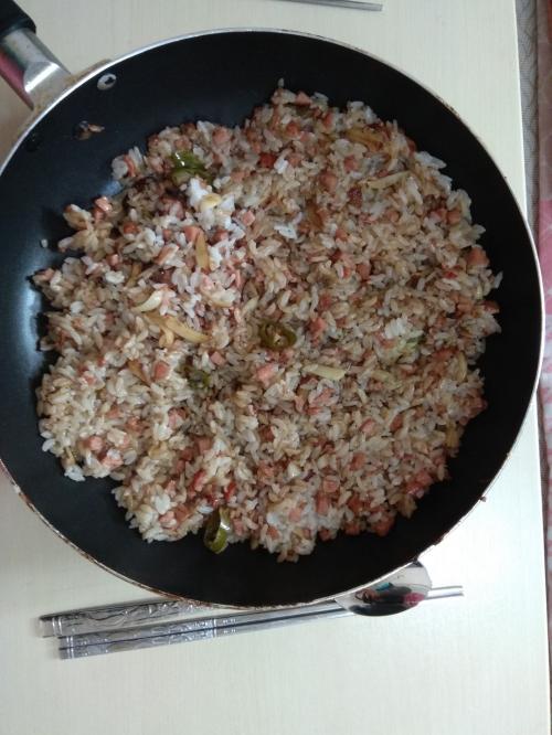 점심때 마늘과 스팸, 고추를 이용하여 볶음밥을 만들어 먹었습니다ㅎㅎ