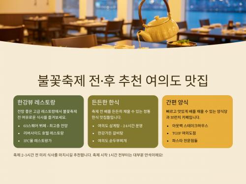 불꽃축제를 즐기기 전, 미리 알아두면 좋은 여의도 근처 맛집과 카페가 있습니다.