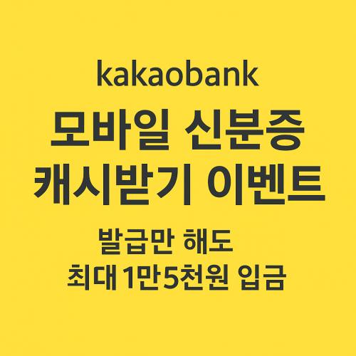 카카오뱅크는 정부 공인 모바일 신분증 서비스를 도입하면서발급 완료 고객에게 최대 15,000원 캐시를 지급하는 이벤트를 진행 중입니다.