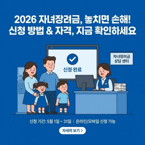 안녕하세요! 오늘은 2026 자녀장려금 신청방법, 지급일, 금액, 재산 조회, 산정표 기준까지 한 번에 정리해보려고 해요. 자녀장려금은 매년 신청 시기만 놓쳐도 아쉬움이 큰 제도라서, 정확한 기준을 미리 확인해두는 게 정말 중요합니다. 특히 2026년에 신청하는 자녀장려금은 2025년 소득과 2025년 6월 1일 기준 재산을 바탕으로 심사되기 때문에, “올해 얼마나 벌었는지”만 볼 게 아니라 “작년 기준으로 내가 조건이 되는지”를 체크해야 해요. 신청 대상인지 헷갈리는 분들을 위해 복잡한 내용은 최대한 쉽게 풀어드릴게요.