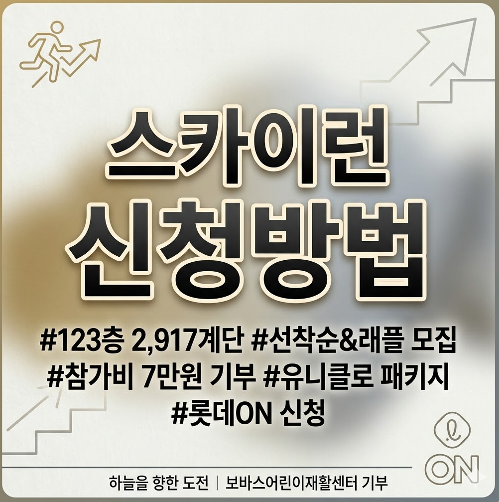 1층부터 123층까지 총 2,917개의 계단을 오르는 이번 대회는 선착순 및 래플(추첨) 방식으로 모집하며, 신청은 오직 롯데ON 앱을 통해 가능합니다. 참가비는 70,000원으로 전액 어린이 재활센터에 기부되는 뜻깊은 행사입니다. 참가자에게는 유니클로 기능성 티셔츠, 스포츠 삭스 등이 포함된 레이스 키트가 제공되며, 완주 시 메달과 디지털 기록증이 수여됩니다. 40세 이상 참가자는 당일 현장 검진이 필수인 만큼 철저한 안전 관리 속에 진행됩니다.