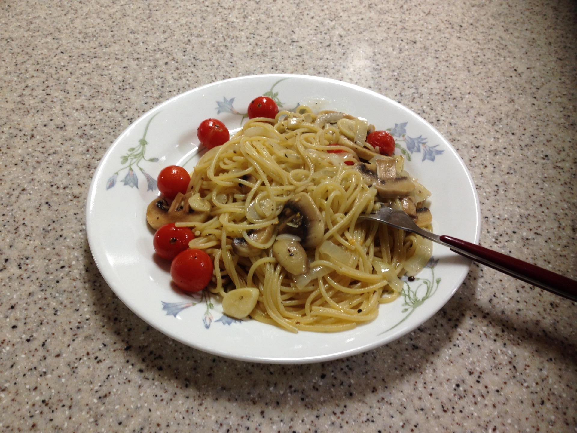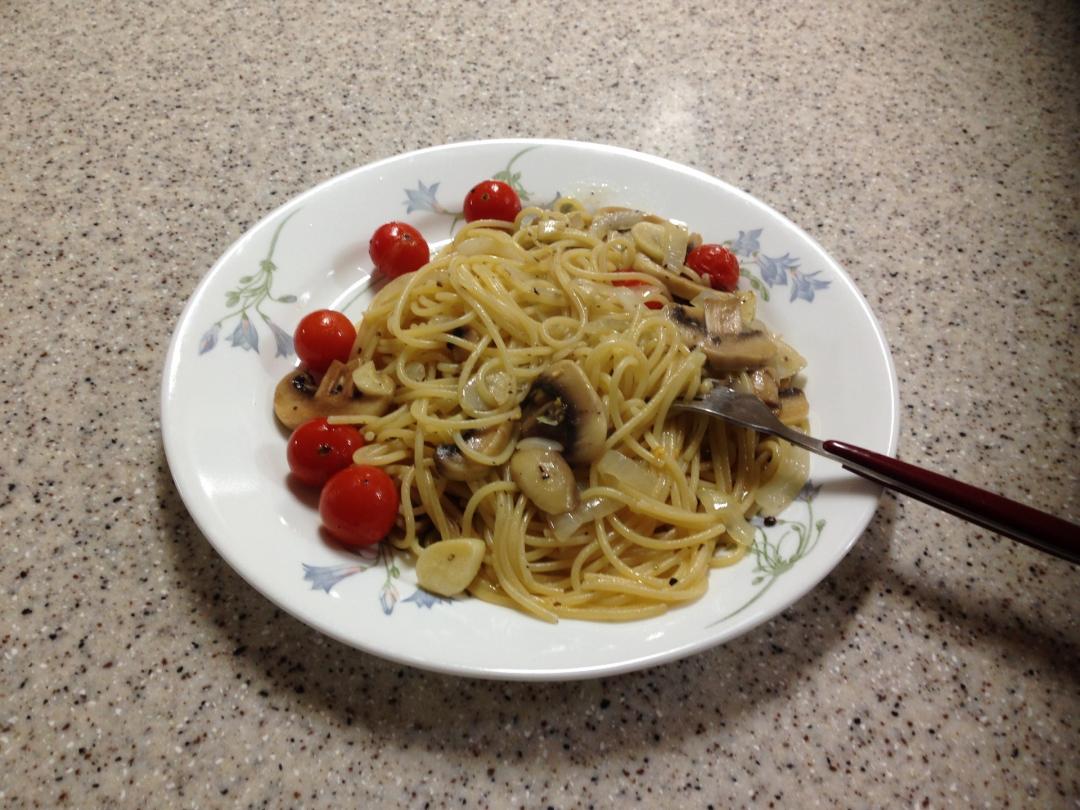 방울 토마토, 양송이, 양파를 추가한 오일 파스타 입니다.