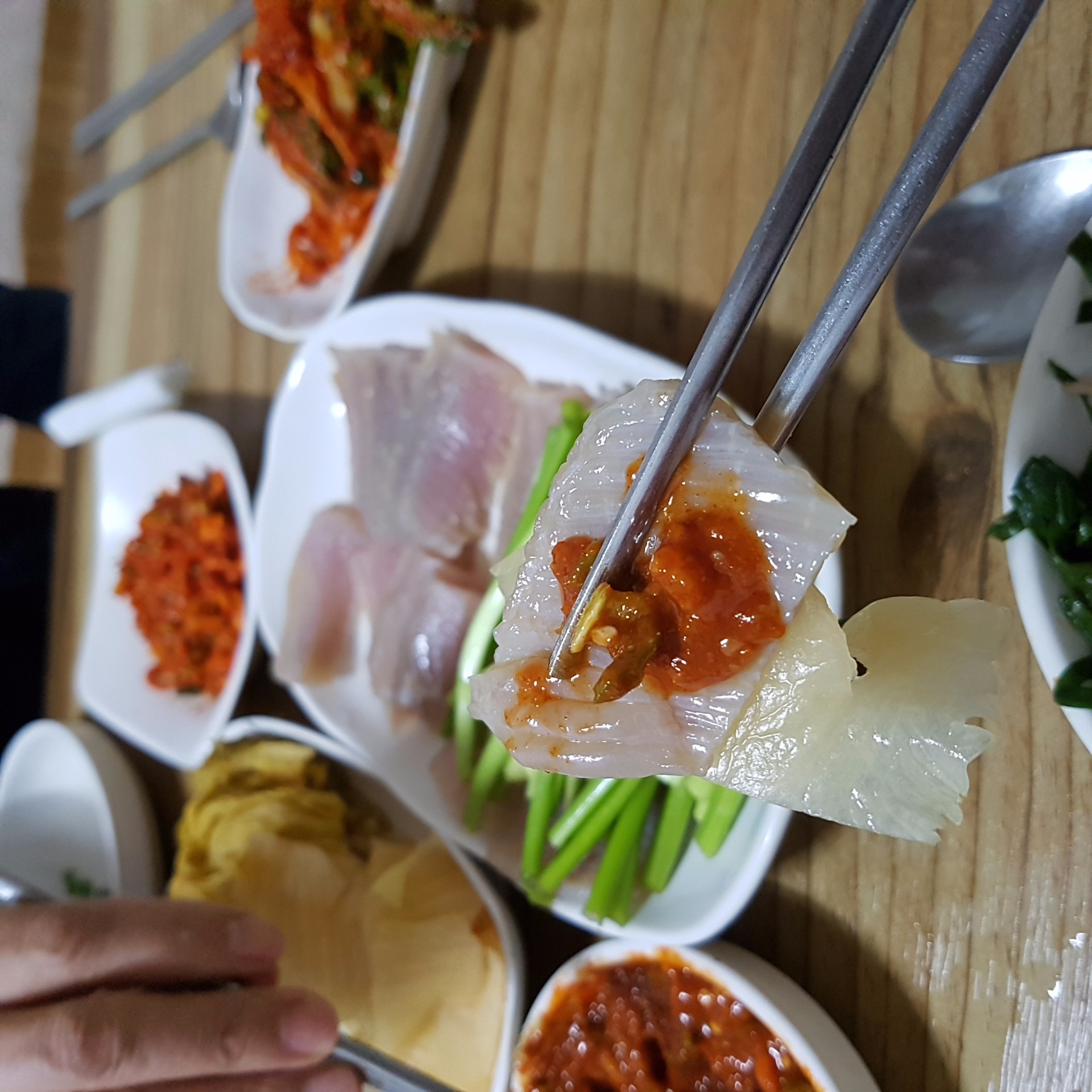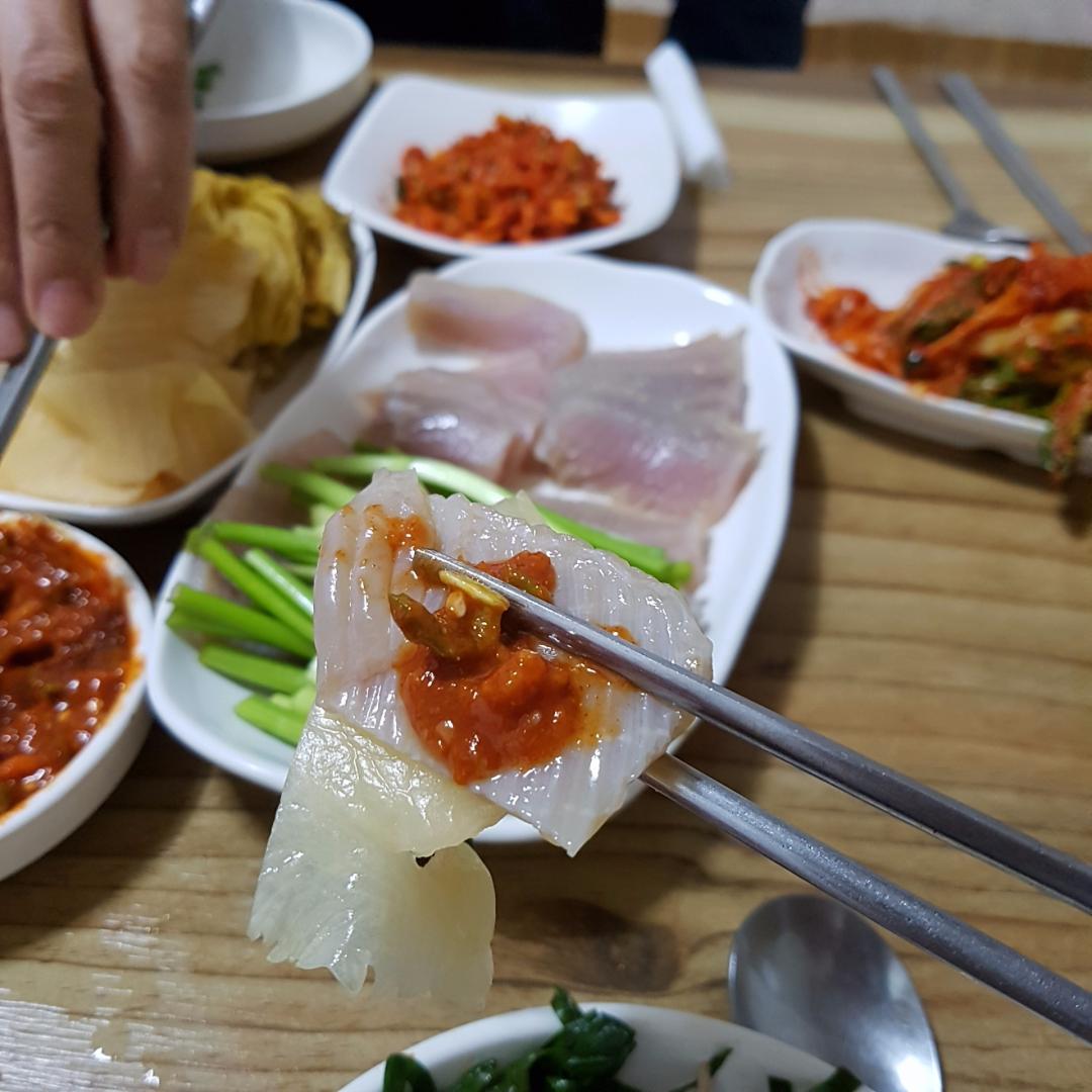 홍어를 좋아하진 않았는데 요즘 땡기네요 많이는 못먹는데 자꾸 생각나서 쭈꾸미 먹다 홍어사시미 시켰어요.