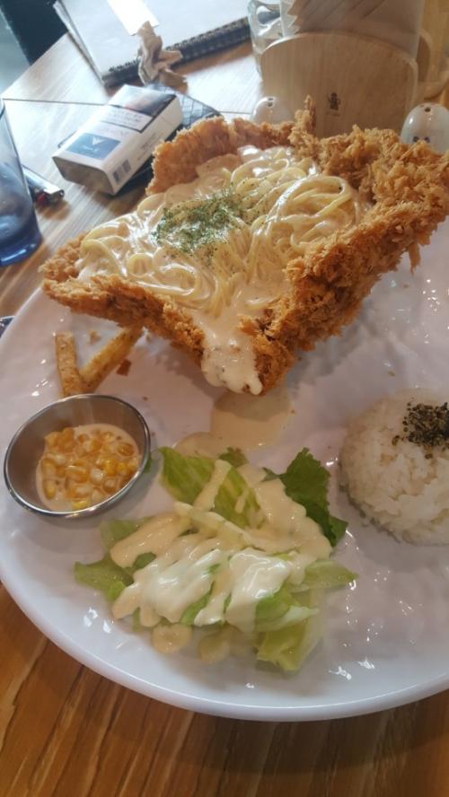 신기하네요 돈까스를 그릇처럼 만들어서 파스타를 담는다는게.. | ||