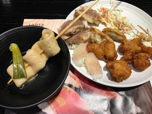 첫 사진은 첫 접시라서 종류별로 한가지씩 갖고 왔어요. 모밀 괜찮았고요. 왼쪽에 타코야끼 위에는 꼬치로해서 먹는건데 그걸 모르고 그냥 갖고와서 먹었어요. 꼬치에 뿌리는 치즈나 소스같은게 있었는데 모르고 가져왔어요. 연어생선구이도 괜찮았어요. 튀김도 바삭하니 괜찮았고요. 초밥이나 롤도 사진에 있는거말고 가지,새송이,계란등이 올라간게 있지만 제 입맛에는 안맞을꺼같아서 안담아왔어요.
