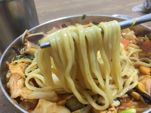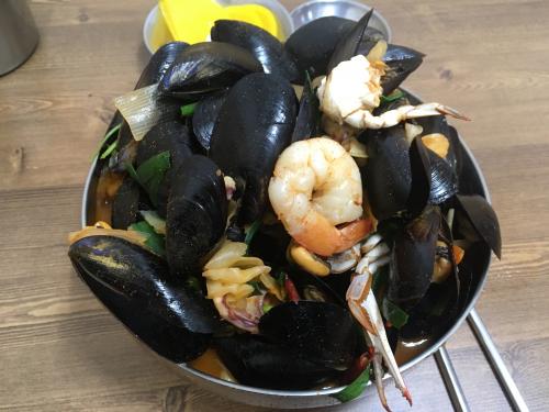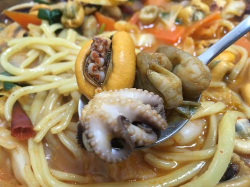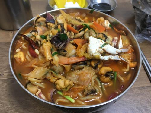 베이스로 산더미처럼 홍합이 들어가고 미더덕 오만디 오징어 새우 꽃게 주꾸미가 들어갑니다