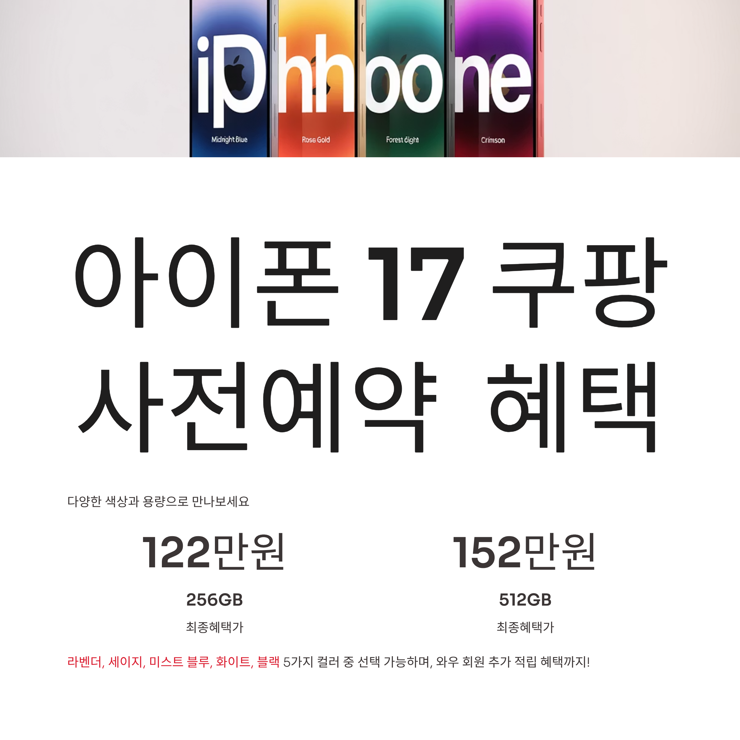 본 글은 아이폰17 시리즈와 쿠팡 사전예약 혜택에 대한 일반적인 정보 제공을 목적으로 작성되었습니다. 실제 상품 정보, 혜택 조건, 배송 일정 등은 쿠팡 및 Apple 공식 안내에 따라 변동될 수 있으니, 반드시 최신 공지를 확인 후 구매를 결정하시기 바랍니다.