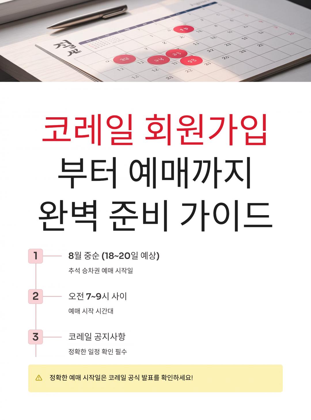 본 글은 2025 추석 기차표 예매와 코레일 홈페이지 회원가입에 대한 일반적인 정보를 제공하기 위해 작성되었습니다. 실제 예매 일정과 절차는 반드시 코레일 공식 홈페이지 공지를 확인하시기 바랍니다.