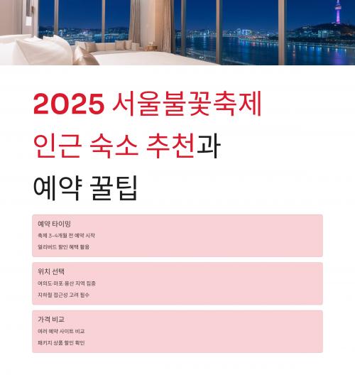 본 글은 불꽃축제 관련 일반적인 정보를 제공하기 위한 것이며, 실제 예약 가능 여부와 조건은 반드시 각 호텔 및 예약 플랫폼의 공식 안내를 확인해야 합니다. 실시간 가격 변동과 예약 정책 차이가 있으므로 최종 결정 전 반드시 최신 정보를 확인하시기 바랍니다.​