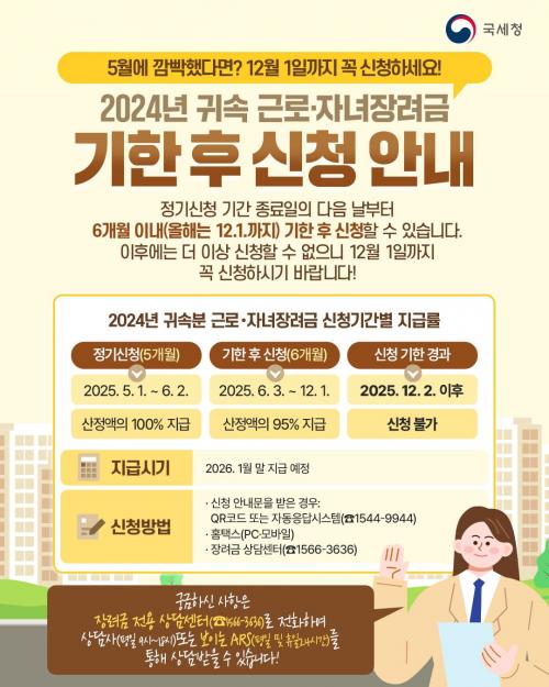 정기 신청을 놓쳤다고 해서 근로장려금을 완전히 포기할 필요는 없습니다. 지금도 '기한 후 신청'으로 최대 95%까지 받을 수 있는 기회가 열려있으니, 이 기간을 놓치면 2024년 소득분에 대한 지원은 영영 받을 수 없어요. 지금 당장 확인하고 신청 절차를 시작해 보세요! 지금 바로 신청하기 근로장려금 기한후 신청 기간, 신청 방법 근로장려금 기한후 신청 기간, 신청 방법 근로장려금 기한 후 신청 개요 근로장려금은 근로·사업·종교인 소득이 있는 저소득 가구의 생활 안정을 지원하기 위해 정부가 현금으로 지급하는 제도입니다. 정기·반기 신청을 놓쳤더라도, 2025년 6월 3일부터 12월 1일까지 기한 후 신청이 가능합니다. 단, 이 기간에 신청하면 지급액이 5% 감액됩니다. 신청 가능 기간과 방식 정기 신청: 2025년 5월 1일 ~ 6월 2일 (100% 지급) 기한 후 신청: 2025년 6월 3일 ~ 12월 1일 (95% 지급) 신청 방법: ① 홈택스(PC) – 로그인 후 ‘장려금 신청’ 메뉴 ② 손택스(앱) – ‘근로장려금 신청’ 선택 ③ ARS(1544-9944) – 주민번호·개별인증번호 입력 ④ 세무서 방문 및 대리 신청 ⑤ 안내문 내 QR코드 또는 링크 접속 지금 바로 신청하기 근로장려금 기한후 신청 기간, 신청 방법 근로장려금 기한후 신청 기간, 신청 방법 가구 유형별 최대 지급액 비교 가구 유형 정기 신청 최대액 기한 후 신청 지급액(95%) 감액 금액(5%) 단독 가구 1,650,000원 1,567,500원 82,500원 홑벌이 가구 2,850,000원 2,707,500원 142,500원 맞벌이 가구 3,300,000원 3,135,000원 165,000원 신청 자격 조건 소득 요건: 단독 가구: 연 2,200만 원 미만 홑벌이 가구: 연 3,200만 원 미만 맞벌이 가구: 연 4,400만 원 미만 재산 요건: 2024년 6월 1일 기준 가구원 전체 재산 합계 2억 4천만 원 미만 1억 7천만 원 이상~2억 4천만 원 미만일 경우 50%만 지급 재산 범위: 주택, 토지, 건물, 자동차, 예금, 주식, 보험 등 (부채 제외) 신청 시 주의 사항 허위·부정 신청 시 전액 환수 및 가산세 부과 국세 체납이 있는 경우 최대 30%까지 차감 지급까지 약 4개월 소요 결론 근로장려금은 단순한 현금 지원이 아닌, 열심히 일하는 저소득 가구에 대한 든든한 버팀목입니다. 정기 신청을 놓쳤더라도 기한 후 신청으로 충분히 혜택을 받을 수 있습니다. 단, 기간을 놓치지 말고 필요한 서류와 절차를 미리 준비해 두는 것이 중요합니다. Q&A Q1. 기한 후 신청 시 지급액이 왜 줄어드나요? A1. 정기 신청 기한을 넘기면 제도상 감액(5%)이 적용되어 95%만 지급됩니다. Q2. 기한 후 신청 기간에 못 하면 어떻게 되나요? A2. 해당 연도 소득분에 대한 근로장려금은 더 이상 신청할 수 없습니다. Q3. 재산 요건 계산 시 부채를 뺄 수 있나요? A3. 아니요. 부채는 제외하지 않고 총자산 기준으로 판단합니다. Q4. 신청 후 언제 지급되나요? A4. 접수일로부터 약 4개월 이내에 지급됩니다. Q5. ARS 신청 시 필요한 것은? A5. 주민등록번호와 안내문에 기재된 개별인증번호가 필요합니다. 신청안하면 못받는 313만원 지금 바로 신청하기 근로장려금 기한후 신청 기간, 신청 방법 신청하러 가기 오늘 보지않기