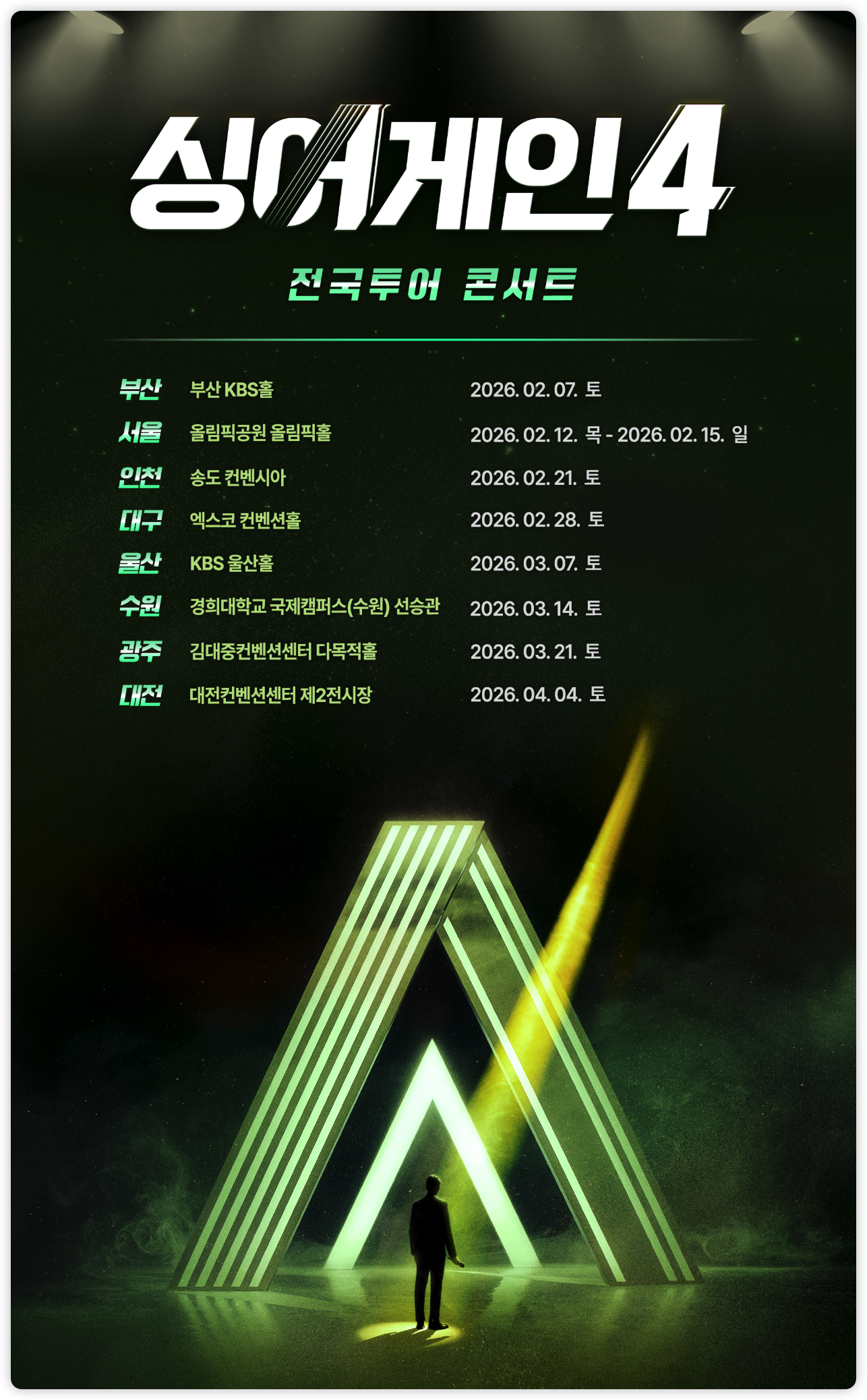 이번 투어는 부산 KBS홀(2/7)을 시작으로, 서울 올림픽공원(2/12~2/15), 인천 송도컨벤시아(2/21), 대구 엑스코(2/28), 울산 KBS홀(3/7), 수원 경희대 국제캠퍼스(3/14), 광주 김대중컨벤션센터(3/21), 그리고 대전컨벤션센터(4/4)까지 전국 8개 도시에서 펼쳐집니다.