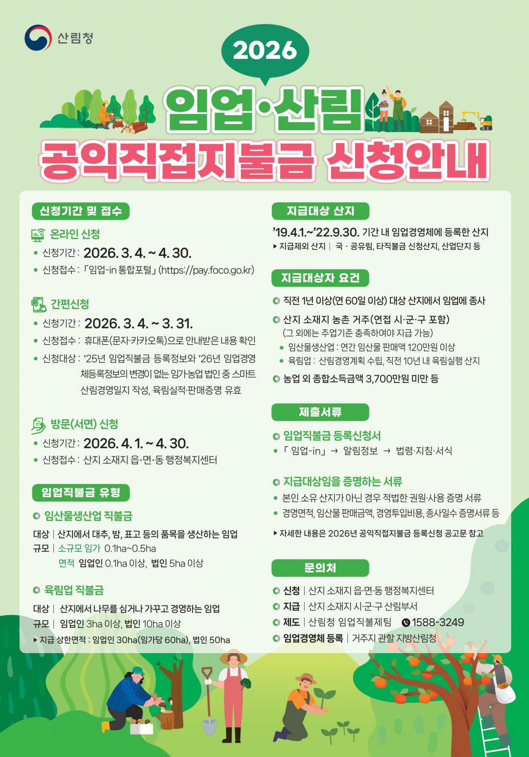 2026년 임업직불금 신청이 시작됐다고 해서 관련 정보 찾아보다가 신청 기간이랑 대상 조건, 신청 방법까지 한 번에 정리된 글이 있어서 공유드립니다.