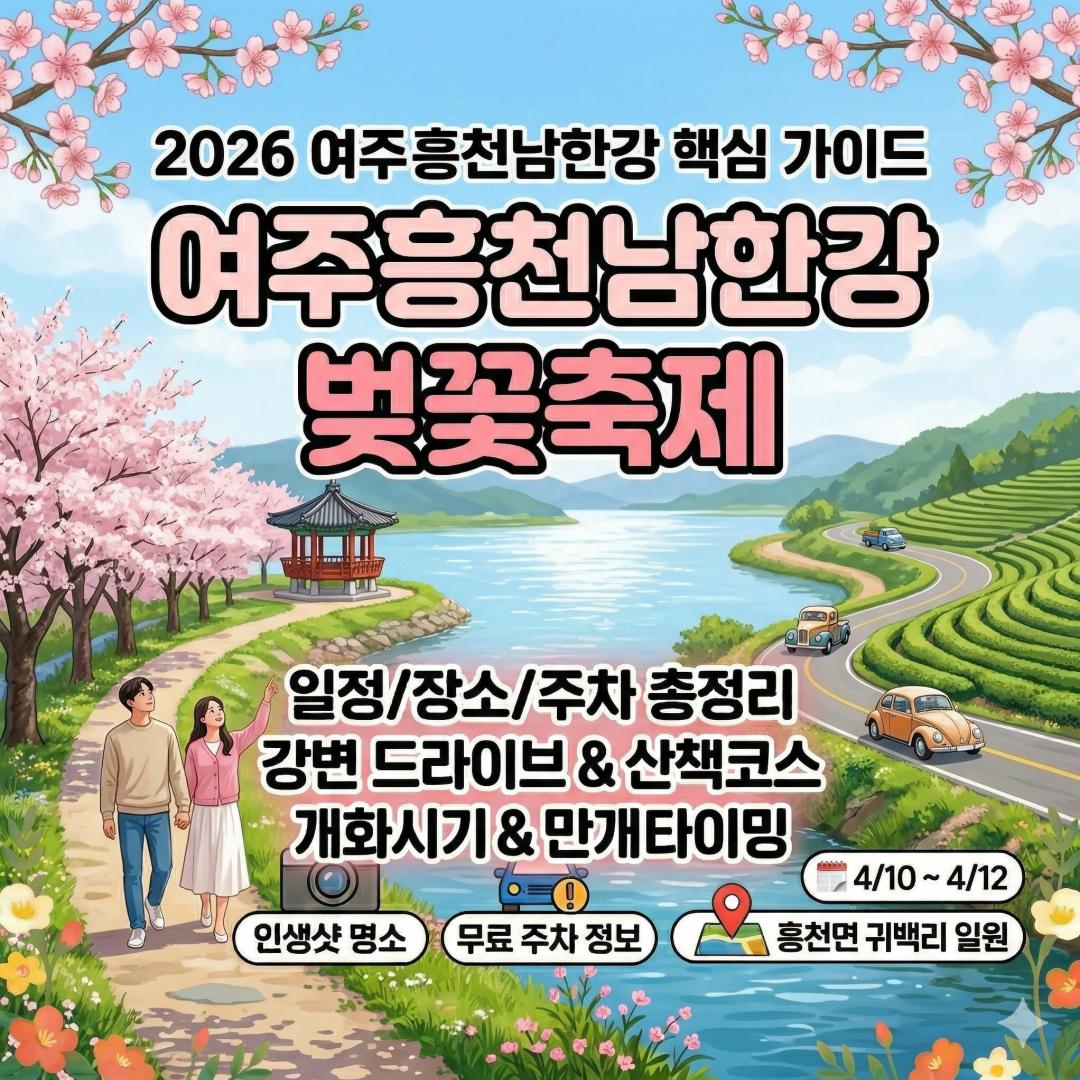사람 붐비는 벚꽃 명소가 부담스럽다면, 지금이 기회입니다. 여주흥천남한강 벚꽃축제는 한적함과 풍경을 동시에 잡을 수 있는 숨은 명소입니다. 드라이브·산책·사진까지 모두 가능한 핵심 정보를 지금 바로 확인해보세요. 벚꽃 만개 타이밍 확인 2026 여주 벚꽃축제 일정 핵심정리 2026 여주흥천남한강 벚꽃축제는 4월 10일부터 12일까지 3일간 진행됩니다. 장소는 경기도 여주시 흥천면 귀백리 일원이며, 남한강을 따라 이어진 벚꽃길이 핵심 포인트입니다. 특히 행사 기간 중 일부 구간은 차량 없는 거리로 운영되어 더욱 안전하고 여유롭게 즐길 수 있습니다. 구분 내용 축제명 여주흥천남한강 벚꽃축제 일정 2026.04.10 ~ 04.12 위치 경기도 여주시 흥천면 귀백리 입장료 무료 벚꽃 만개 타이밍 확인 드라이브 코스 추천 루트 이 축제의 핵심은 단순한 벚꽃 구경이 아니라 ‘드라이브 경험’입니다. 남한강을 따라 이어지는 도로는 벚꽃 터널을 형성하며 이동 자체가 힐링이 됩니다. 개인적으로는 차량 이동 후 중간 포인트에서 내려 산책을 병행하는 코스를 추천합니다. 추천 루트는 남한강 벚꽃길 → 강변 산책로 → 전망 포인트 순입니다. 이 동선을 따르면 사진, 풍경, 휴식을 모두 만족할 수 있습니다. 벚꽃 만개 타이밍 확인 주차 꿀팁과 현실 정보 축제 방문 시 가장 중요한 요소는 주차입니다. 행사장 주변에는 임시 주차장이 운영되며 대부분 무료입니다. 하지만 주말 낮 시간에는 빠르게 만차가 되므로 오전 방문이 가장 효율적입니다. 외곽 주차 후 도보 이동이 가장 현실적인 방법이며, 도로 위 임시 정차는 매우 위험하므로 반드시 지정 주차장을 이용해야 합니다. 항목 내용 주차장 임시 주차장 운영 요금 무료 중심 혼잡 시간 주말 낮 추천 오전 방문 + 외곽 주차 벚꽃 만개 타이밍 확인 개화시기 언제가 베스트? 벚꽃은 타이밍이 가장 중요합니다. 여주 지역 기준으로 4월 초에 개화가 시작되고, 4월 중순에 만개합니다. 따라서 축제 기간 중반이 가장 아름다운 시기로 추천됩니다. 특히 날씨가 따뜻하면 개화가 앞당겨질 수 있으니 방문 전 개화 상황을 꼭 확인하는 것이 좋습니다. 현장 분위기와 즐길거리 낮에는 벚꽃 산책로와 드라이브를 즐기고, 밤에는 야간 별빛 조명이 더해진 벚꽃길을 경험할 수 있습니다. 포토존, 공연, 먹거리 부스까지 다양하게 구성되어 있어 가족 단위 방문에도 적합합니다. 직접 방문해보면 복잡한 서울 벚꽃과는 확연히 다른 ‘여유로운 감성’을 느낄 수 있습니다. 이 점이 가장 큰 매력입니다. 방문 전 체크리스트 차량 이동이 많기 때문에 연료 확인은 필수입니다. 또한 강변 산책을 위해 편한 신발을 준비하는 것이 좋습니다. 주말에는 교통 체증이 심할 수 있으니 이동 시간도 넉넉히 잡아야 합니다. 마무리 한마디 여주흥천남한강 벚꽃축제는 단순한 꽃 구경이 아닌 ‘경험형 여행’입니다. 드라이브, 산책, 사진까지 한 번에 즐기고 싶다면 최고의 선택입니다. 올해 봄, 조금 더 여유로운 벚꽃 여행을 계획해보세요. 지금 일정 확인하고 미리 준비하면 훨씬 더 만족스러운 여행이 됩니다. Q&A Q1. 언제 방문하는 게 가장 좋나요? 축제 중반인 4월 11일 전후가 만개 시기로 가장 추천됩니다. Q2. 주차는 무료인가요? 대부분 무료이며 임시 주차장이 운영됩니다. Q3. 사람이 많나요? 서울보다 훨씬 한적하지만 주말 낮에는 혼잡할 수 있습니다. Q4. 드라이브만 해도 괜찮나요? 네, 드라이브만으로도 충분히 만족도가 높습니다. Q5. 가족 방문 괜찮나요? 산책로와 체험 프로그램이 있어 가족 단위 방문에 적합합니다. 여주흥천남한강 벚꽃축제 2026년 일정 확인하기