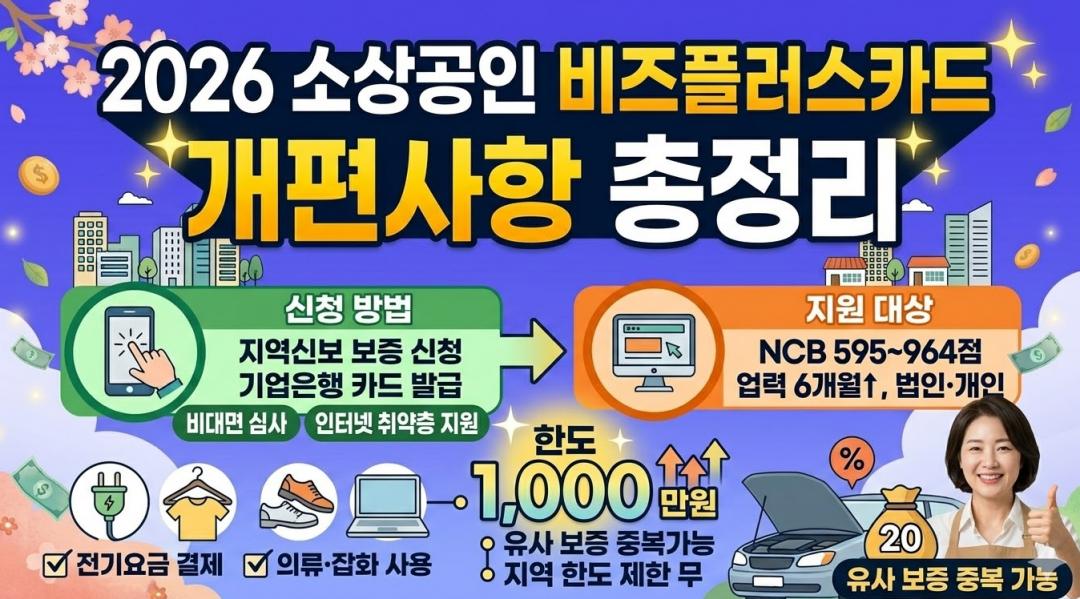 자금 유동성 때문에 고민이신 사장님들께 희소식입니다! 문턱은 낮아지고 혜택은 넓어진 '비즈플러스카드'가 새롭게 개편되었습니다. 시중은행 대출이 어려웠던 소상공인분들도 이번 기회를 꼭 잡으세요.