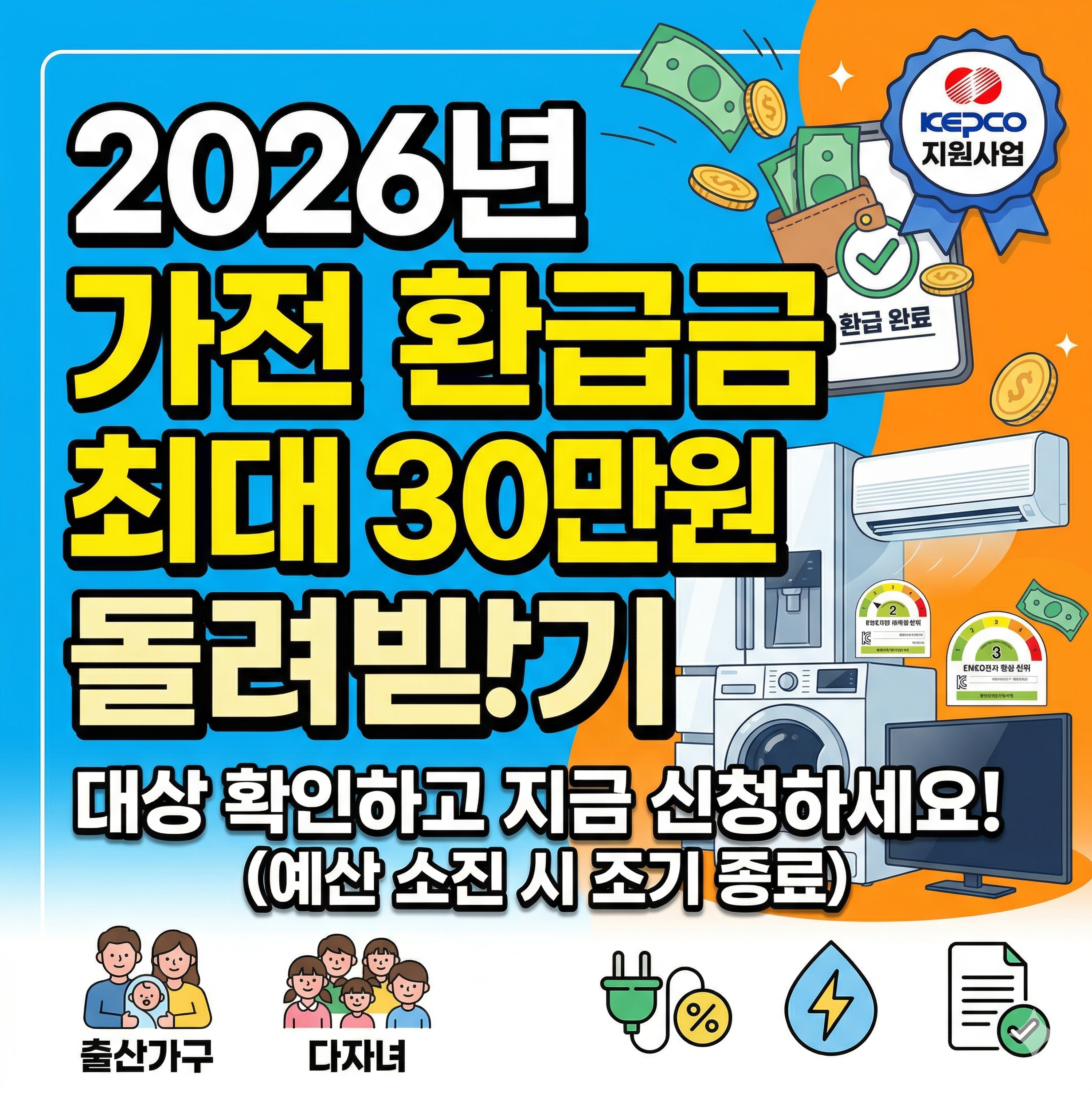 이사나 출산 준비로 가전을 바꿨다면, 그냥 지나치기엔 너무 아까운 지원금이 있습니다. 2026년 한전 고효율 가전제품 구매비용 지원사업은 복지할인 가구라면 최대 30만 원까지 돌려받을 수 있어 지금 확인하는 사람과 놓치는 사람의 차이가 꽤 커집니다. 특히 예산이 소진되면 조기 종료될 수 있어, 대상 여부와 신청 서류를 오늘 바로 체크해두는 것이 유리합니다. 한전 지원금 신청하기 2026 한전가전환급 핵심부터 보기 한국전력공사가 운영하는 고효율 가전제품 구매비용 지원사업은 전기요금 복지할인 가구를 대상으로 진행됩니다. 에너지효율이 높은 가전을 구입하면 구매비용의 일정 비율을 환급해주는 방식이라, 단순한 이벤트가 아니라 실제 생활비를 줄여주는 제도에 가깝습니다. 2026년에는 2월 9일부터 신청이 시작됐고, 2026년 1월 1일 이후 구매분은 소급 적용이 가능합니다. 가장 중요한 포인트는 세 가지입니다. 첫째, 아무 가전이 아니라 지원 대상 품목과 효율등급 기준을 충족해야 합니다. 둘째, 제품에 부착된 에너지효율등급 라벨 기준으로 판단되기 때문에 설명서나 쇼핑몰 화면 캡처만으로는 인정되지 않습니다. 셋째, 지원한도는 매년 새로 생기는 방식이 아니라 과거 지원 이력까지 포함한 가구당 누적 한도라는 점입니다. 가전 환급금 신청하기 누가 얼마나 받을 수 있을까 지원 비율은 가구 유형에 따라 나뉩니다. 다자녀, 대가족, 출산가구는 구매금액의 15%를 지원받고, 장애인, 유공자, 기초생활수급자, 차상위계층, 사회복지시설, 생명유지장치 사용 가구는 30%까지 지원받을 수 있습니다. 다만 모든 유형 모두 가구당 최대 지원한도는 30만 원입니다. 출산가구의 경우 특히 많이 궁금해하시는데, 일반적으로 출생일 기준 3년 미만 영아가 있는 가구가 해당됩니다. 그래서 아이가 어릴 때 냉장고, 식기세척기, 공기청정기처럼 실사용 빈도가 높은 제품을 교체했다면 생각보다 체감 혜택이 큽니다. 육아 중에는 작은 절감도 크게 느껴지잖아요. 이런 제도는 알고 챙기는 사람이 결국 이득을 봅니다. 가구 유형 지원 비율 최대 한도 다자녀 / 대가족 / 출산가구 15% 30만 원 장애인 / 유공자 / 기초생활수급자 / 차상위계층 / 사회복지시설 / 생명유지장치 30% 30만 원 한전 지원금 신청하기 지원 대상 품목과 꼭 확인할 조건 지원 대상 품목은 냉장고, 김치냉장고, 에어컨, 세탁기, 전기밥솥, 진공청소기, 공기청정기, TV, 제습기, 의류건조기, 식기세척기 등 총 11개입니다. 다만 같은 품목이라도 모든 제품이 되는 것은 아니고, 해당 품목별 효율등급 기준을 충족해야 합니다. 실제 신청 과정에서는 제품 본체에 붙은 라벨과 명판 사진이 매우 중요하니 구매 후 바로 촬영해두는 습관이 필요합니다. 반대로 지원이 되지 않는 품목도 있습니다. 대표적으로 시스템에어컨, 냉동고, 이동식 에어컨디셔너는 지원 불가 품목으로 안내되어 있습니다. 그래서 오프라인 매장에서 상담받을 때 “1등급이면 다 되는 거 아닌가요?”라고 생각하기 쉬운데, 품목 자체가 제외되는 경우도 있어 반드시 공식 안내 페이지에서 모델과 품목을 함께 확인해야 합니다. 개인적으로 이런 지원사업은 제품 설치가 끝난 뒤 뒤늦게 알아보면 가장 아쉽더라고요. 라벨을 떼어버렸거나 명판 촬영을 놓치면 다시 확인하는 데 시간이 걸립니다. 냉장고나 김치냉장고처럼 크고 무거운 제품은 설치 직후가 사진 찍기 가장 좋은 타이밍이니, 설치 기사님 방문 전에 가족끼리 꼭 역할을 나눠두는 것이 좋습니다. 이미지 참고 포인트도 간단합니다. 에너지효율등급 라벨 사진은 등급과 적용기준 시행일이 보이도록 선명하게 찍고, 명판 사진은 모델명과 제조번호가 확인되게 촬영하면 됩니다. 제품 전면만 예쁘게 찍은 사진은 신청용 자료로는 거의 도움이 되지 않습니다. 가전 환급금 신청하기 신청 방법은 생각보다 단순합니다 신청은 한전 고효율 가전제품 구매비용 지원사업 홈페이지에서 진행합니다. 순서는 회원가입 및 로그인, 대상자 조회, 제품 정보 입력, 증빙서류 업로드 순으로 비교적 명확합니다. 대상자 조회는 세대주 기준으로 진행되는 경우가 많아 이름과 주민등록번호 등 기본 정보 확인이 필요할 수 있습니다. 제품 정보 입력 단계에서는 구매 매장명, 매장 주소, 제품 모델명, 제조번호, 구매일자, 구매금액 등을 작성하게 됩니다. 이때 예상 지원금이 자동 계산되어 보여서 어느 정도 환급받을 수 있는지 감이 바로 옵니다. 그래서 단순히 “될까 안 될까”보다 “얼마를 받을 수 있나”까지 한 번에 확인할 수 있는 점이 꽤 편리합니다. 필수 서류는 기본적으로 에너지소비효율등급 라벨 사진, 제품 명판 사진, 거래내역서, 카드매출전표 또는 영수증입니다. 일부 가구 유형은 주민등록등본 등 추가 서류가 필요할 수 있으니 자신의 복지할인 유형에 맞는 제출 목록을 다시 체크해야 합니다. 서류가 하나라도 불명확하면 보완 요청이 들어올 수 있어, 처음부터 또렷하게 준비하는 것이 시간을 아끼는 지름길입니다. 이사·출산가구라면 특히 놓치지 말아야 하는 이유 이사와 출산은 가전 교체가 가장 많이 일어나는 시기입니다. 냉장고 
