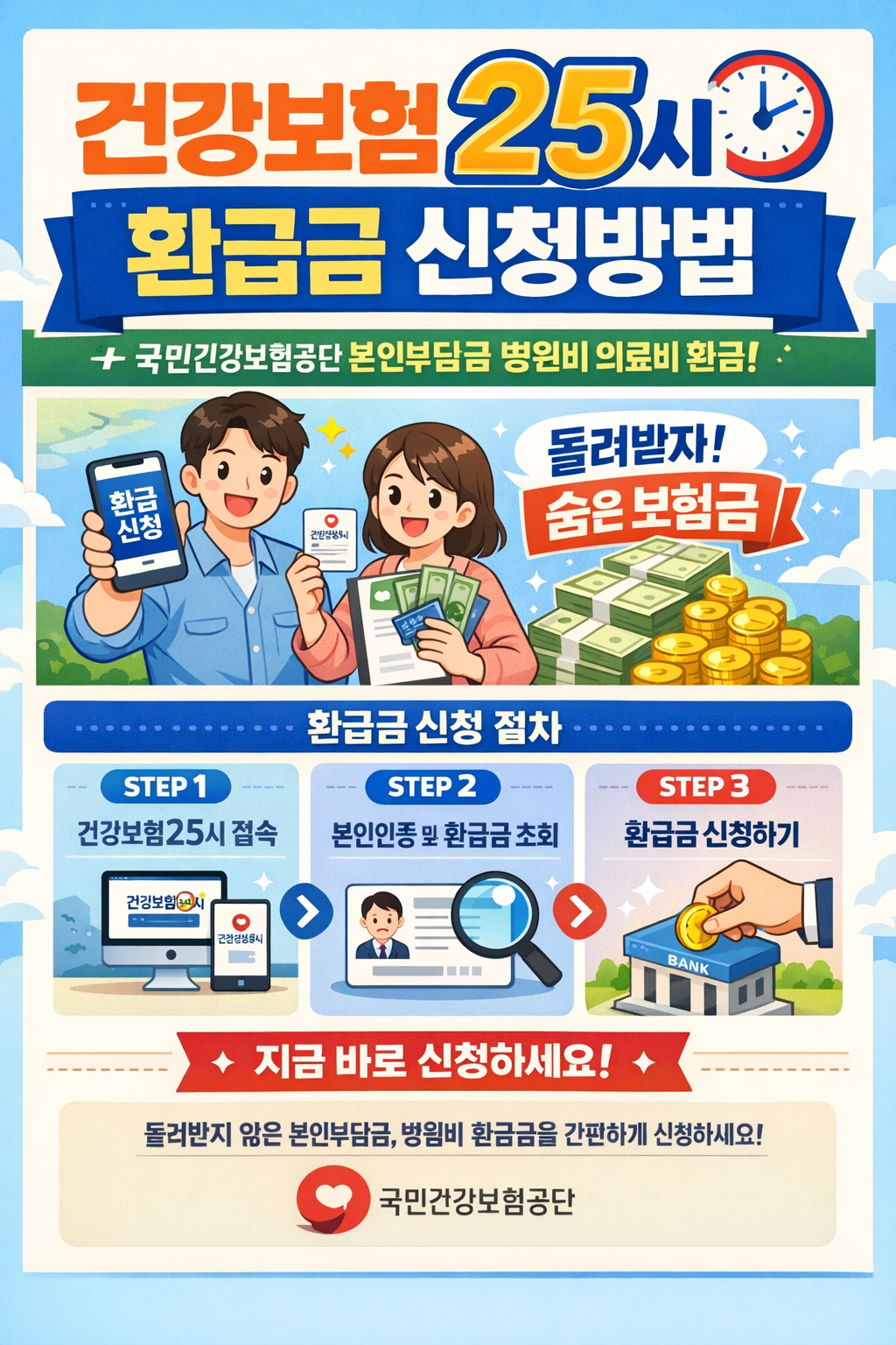 2026년 기준 건강보험25시 환급금 신청방법과 국민건강보험공단 본인부담금 환급 제도에 대해 상세히 안내합니다. 초과된 병원비와 의료비 환급금을 놓치지 않고 조회하고 신청하는 실전 가이드를 지금 바로 확인하세요.