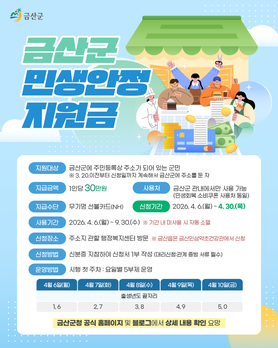 금산군 민생안정지원금 30만원, 놓치면 바로 체감 손해가 될 수 있습니다. 신청 기간은 2026년 4월 6일부터 4월 30일까지로 짧고, 첫 주는 요일제까지 운영돼 미리 확인한 사람만 덜 바쁘게 움직일 수 있어요. 지금 꼭 알아야 할 대상 조건, 신청 장소, 사용처, 주의사항까지 한 번에 정리했습니다. 민생지원금 3차 바로 신청 금산군 지원금 핵심 요약 이번 금산군 민생안정지원금은 1인당 30만원이 지급되는 지역경제 활성화 정책입니다. 금산군이 밝힌 취지는 국제 유가와 원자재 가격 상승, 물가 부담, 소비 위축 속에서 군민의 생활 부담을 덜고 지역 상권에 실제 소비를 돌게 하려는 데 있습니다. 지원 대상은 2026년 3월 20일 기준부터 신청일까지 계속해서 금산군에 주민등록상 주소를 유지한 군민입니다. 군민뿐 아니라 일정 요건을 충족하는 결혼이민자, 영주자격 취득 후 체류 등록이 된 외국인도 포함됩니다. 단순히 주소만 잠깐 둔 경우가 아니라 기준일부터 신청일까지 계속 주소를 유지해야 한다는 점이 중요합니다. 신청 기간은 2026년 4월 6일 월요일부터 4월 30일 목요일까지이며, 접수 시간은 오전 9시부터 오후 6시까지입니다. 지급 수단은 무기명 선불카드 NH선불카드이고, 사용 기간은 2026년 9월 30일 수요일까지입니다. 기간 내 미사용 금액은 자동 소멸되므로 받는 것만큼 쓰는 계획도 미리 세워두는 게 좋습니다. 민생지원금 3차 바로 신청 누가 받을 수 있고 어디서 신청하나 지원 대상은 생각보다 넓지만, 신청 기준은 꽤 분명합니다. 2007년 12월 31일 이전 출생한 성인은 개인별 신청 및 지급이 원칙이며, 가족 단위의 경우 세대주 또는 배우자가 세대 구성원 전원을 함께 신청할 수 있습니다. 다만 동거인은 제외되고, 주민등록표에 성인인 구성원이 없는 미성년 세대주는 직접 신청이 가능합니다. 미성년자는 동일 세대의 세대주가 신청하고 지급받는 방식입니다. 고령자나 장애인 등 직접 방문이 어려운 주민을 대상으로는 찾아가는 신청도 운영됩니다. 현장에서 이런 부분이 은근히 많이 헷갈리는데, 가족 대신 신청할 때는 관계 증빙 서류가 필수라서 신분증만 들고 갔다가 다시 오는 경우가 생길 수 있습니다. 신청 장소는 금산읍 주민은 금산인삼약초건강관, 나머지 9개 면 주민은 주소지 관할 행정복지센터입니다. 첫 주에는 혼잡을 줄이기 위해 출생연도 끝자리 기준 요일별 5부제가 운영됐습니다. 월요일은 1·6, 화요일은 2·7, 수요일은 3·8, 목요일은 4·9, 금요일은 5·0입니다. 이런 방식은 기다리는 시간을 크게 줄여주기 때문에 초반 방문 예정이라면 꼭 확인해야 합니다. 항목 내용 지원금액 1인당 30만원 기준일 2026년 3월 20일 신청기간 2026년 4월 6일 ~ 4월 30일 09:00~18:00 지급수단 무기명 선불카드 NH선불카드 사용기한 2026년 9월 30일까지, 이후 자동 소멸 민생지원금 3차 바로 신청 어디서 쓸 수 있고 어디는 안 되나 이 지원금의 진짜 목적은 단순 현금 지급이 아니라 지역 내 소비를 돌리는 데 있습니다. 그래서 사용처도 금산군 관내로 제한됩니다. 전통시장, 동네마트, 식당, 카페, 의류점, 미용실, 안경원, 교습소, 학원, 약국, 프랜차이즈 가맹점 일부, 소상공인이 독립적으로 운영하는 매장 등 생활 밀착 업종 중심으로 사용할 수 있습니다. 반대로 사용불가 업종도 뚜렷합니다. 대형마트와 기업형 슈퍼마켓, 온라인 전자상거래 쇼핑몰, 유흥업종, 사행성 업종, 환금성 업종, 보험업, 세금과 공공요금, 교통 통신요금 자동이체, 프랜차이즈 직영점, PG결제 시스템을 사용하는 일부 키오스크와 테이블 주문 시스템에서는 제한됩니다. 카드로 결제된다고 다 되는 것이 아니라는 점이 포인트입니다. 특히 기사에서도 강조된 부분은 대형마트를 제외한 골목상권과 전통시장에서의 사용 유도입니다. 쉽게 말해 주민의 소비가 다시 지역 상인 매출로 이어지는 구조를 만들겠다는 뜻이죠. 개인적으로 이런 지역화폐형 지원은 받는 순간보다 쓰는 순간 체감이 큽니다. 평소 미뤄둔 장보기, 식사, 약국 구매, 아이 학원비 일부 대체 같은 생활지출과 연결하면 활용도가 높습니다. 민생지원금 3차 바로 신청 신청 전 꼭 챙길 준비물과 실수 방지 팁 본인 신청은 비교적 간단합니다. 군민은 신분증과 신청서를 준비하면 되고, 외국인은 외국인등록증 또는 영주권 관련 서류와 외국인등록사실증명서, 필요시 혼인관계증명서나 가족관계증명서가 요구됩니다. 대리 신청은 더 꼼꼼해야 합니다. 대리인 신분증, 지급대상자와 대리인의 관계를 증명할 수 있는 서류, 위임 관련 서류를 챙겨야 현장에서 한 번에 처리됩니다. 또 하나 놓치기 쉬운 건 사용 기한입니다. 9월 30일까지 사용하지 않으면 남은 금액은 사라집니다. 이런 지원금은 받아만 두고 미루다가 놓치는 경우가 의외로 많아요. 신청 직후 사용 가능한 가맹점부터 확인해 두면 훨씬 수월합니다. 금산군 홈페이지나 지역화폐 앱 CHAK에서 가맹점 확인이 가능하다는 안내도 포함돼 있습니다. 행정 혼잡을 줄이기 위해 시행 첫 주에 요일제가 있었던 점도 기억할 만합니다. 이미 지난 일정이라도 비슷한 방식의 추가 접수나 현장 운영이 이어질 수 있으니 공지 확인은 습관처럼 