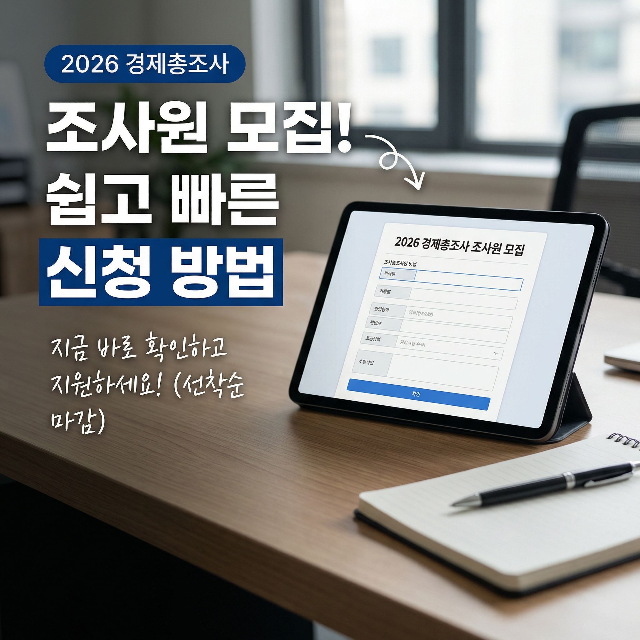 2026 경제총조사 조사원 모집이 시작되면서 많은 분들이 조사요원 알바에 관심을 보이고 있습니다. 특히 단기 고수익 알바를 찾는 분들에게 경제총조사 조사원은 매년 인기 있는 공공기관 일자리입니다. 이번 글에서는 2026 경제총조사 조사원 모집 신청 방법, 기간, 일정, 홈페이지까지 한 번에 정리해드립니다.