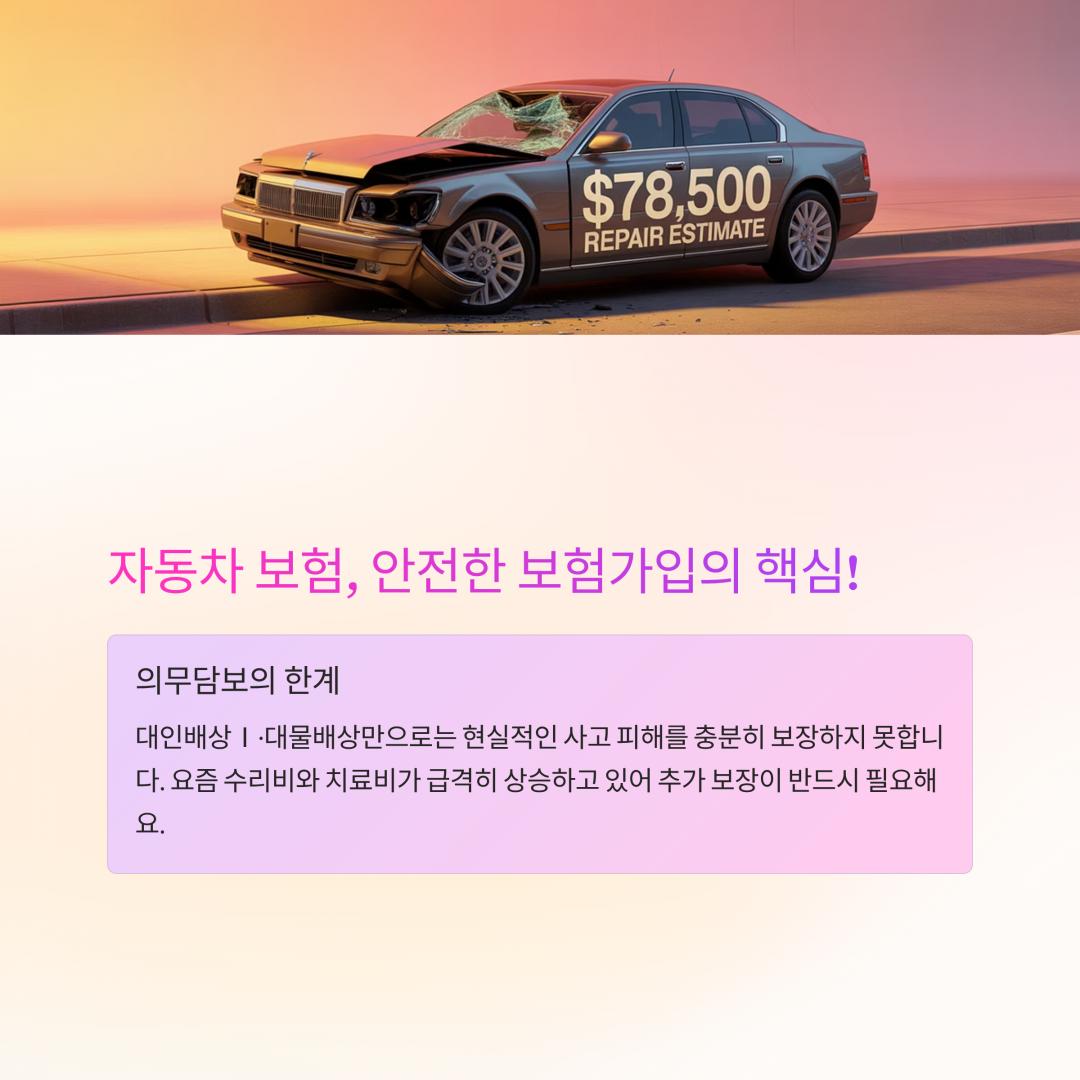많은 운전자가 자동차보험을 가입할 때 가장 먼저 ‘보험료’를 따집니다. 하지만 최소 비용만 추구하면 결국 보장 범위가 너무 좁아 사고 발생 시 큰 부담을 떠안을 수 있습니다. 의무담보만으로 구성된 보험은 법적 기준은 충족하지만, 실제 사고가 났을 때는 수천만 원 이상의 손해를 감당하지 못합니다. 비용을 절약했다고 안심하기에는 너무 위험한 선택인 셈입니다.