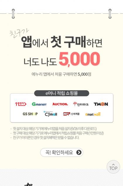 3. [에누리앱]을 경유하여(PC/모바일웹 적용X) 1만원 이상 구매 후 적립버튼 클릭 시 10일 후 5,000포인트가 적립됩니다.