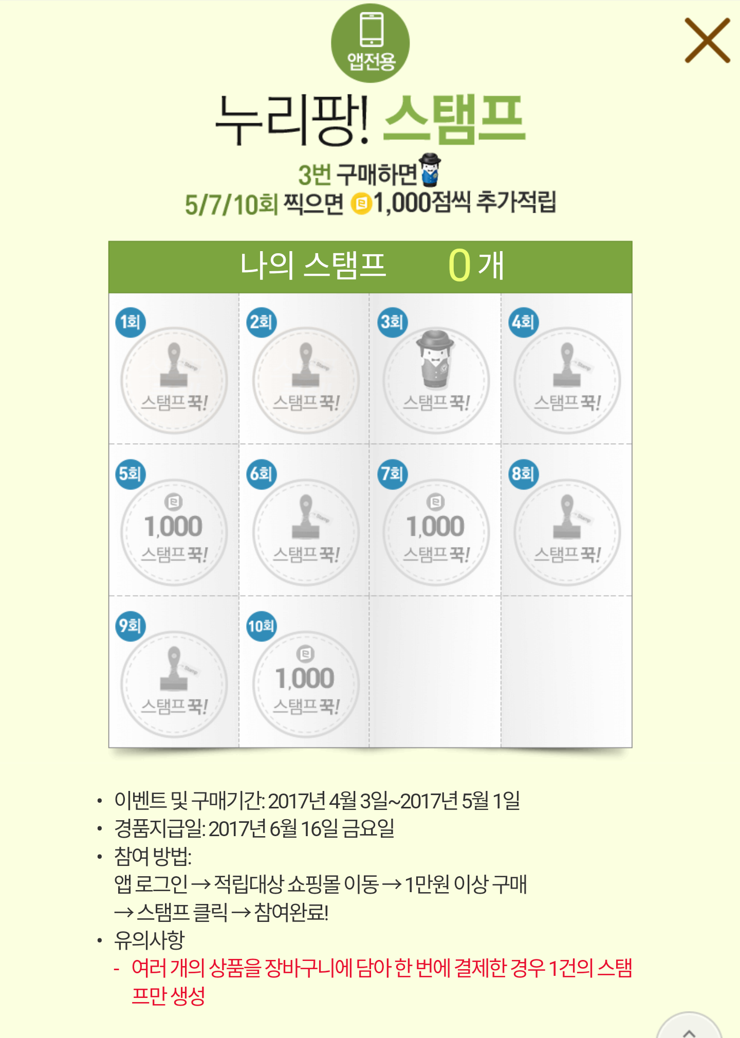 5.앱에서 대상쇼핑몰 스탬프 이벤트(1만원이상 10번구매시) 3000점+2500점(파리바케트 카페아다지오) 적립됩니다.