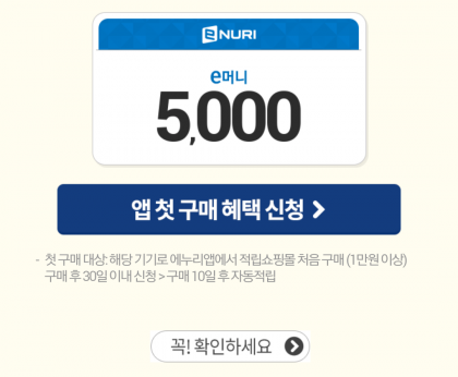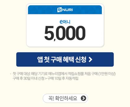 3. [에누리앱]을 경유하여(PC/모바일웹 적용X) 1만원 이상 구매 후 적립버튼 클릭 시 10일 후 5,000포인트가 적립됩니다.