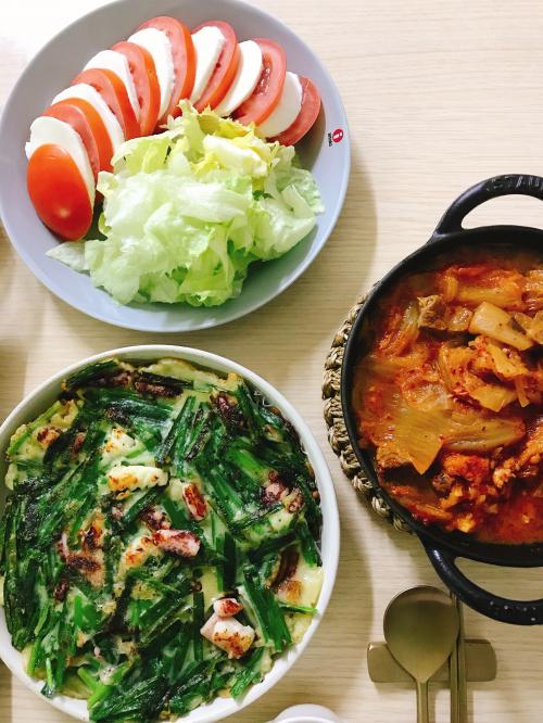 김치찌개 와, 부추오징어전, 소고기부추버섯말이, 카프레제 에요.