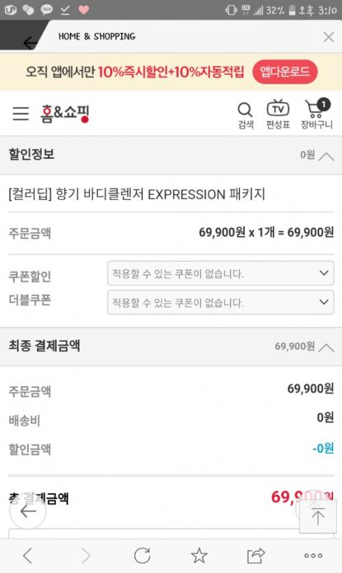 홈앤쇼핑 10%즉시할인 받고 10% 자동적립 받았어요~