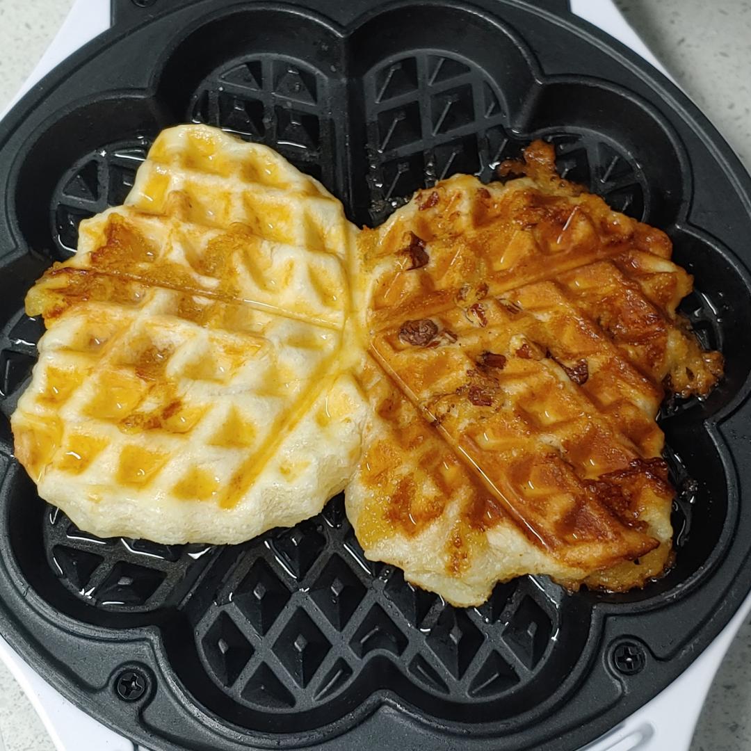 와플기 예열하고 기름묻혀 한번 닦고 만들었어요