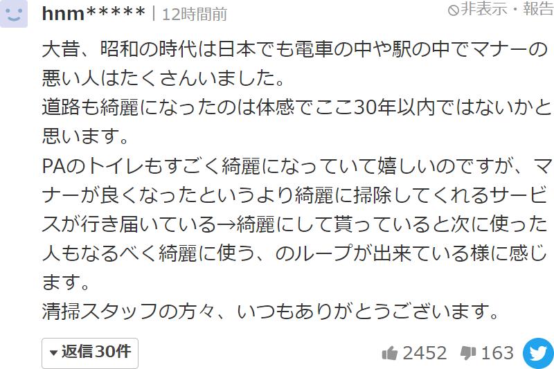 매너가 좋아졌다기보다는 깨끗하게 청소해 주는 서비스가 잘 되어 있다→깨끗하게 해주다 보면 다음에 사용한 사람도 가급적 깨끗하게 사용하는 패턴이 생긴 것처럼 느낍니다.