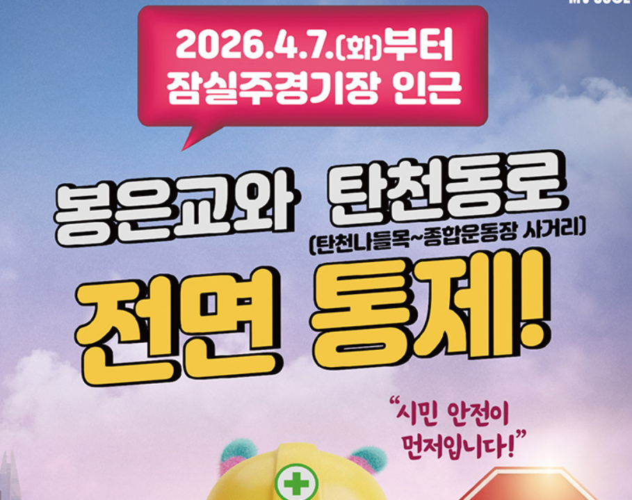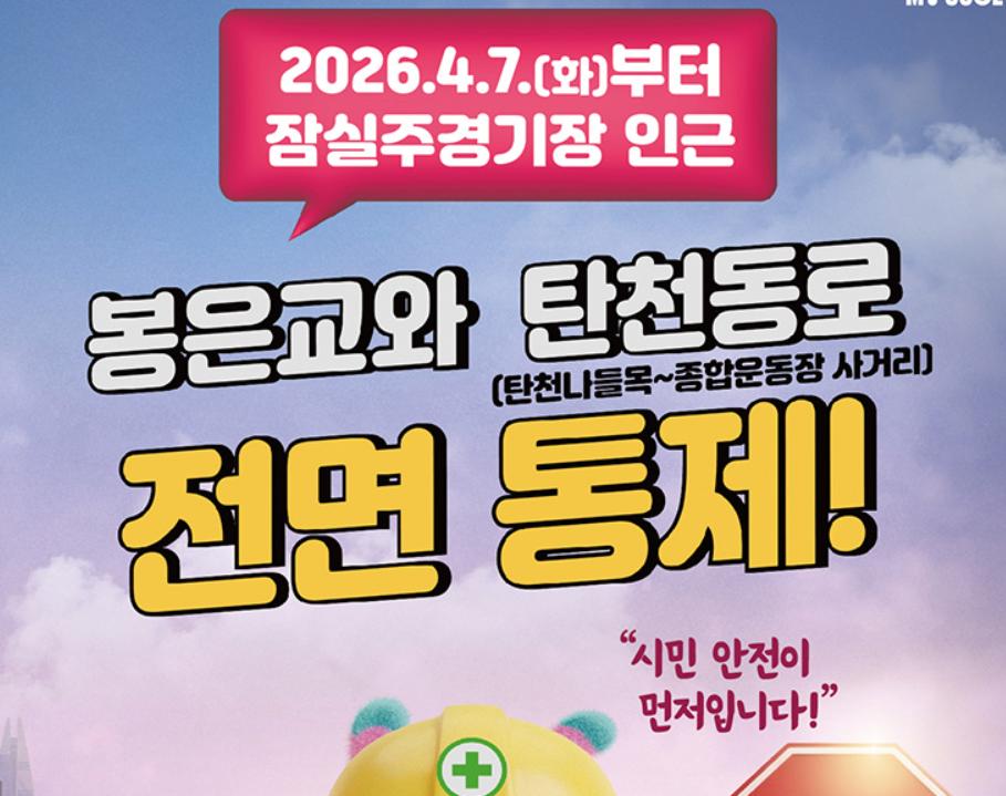 탄천동로 지하화 공사에 따라 2026년 4월 7일(화) 오전 10시부터 봉은교와 탄천동로(종합운동장사거리~탄천나들목) 구간의 통행이 전면 통제됩니다.