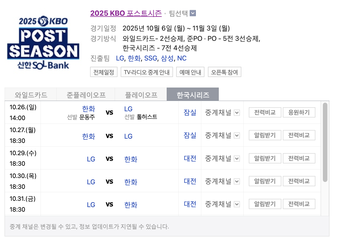 2025년 KBO 리그의 대미를 장식할 한국시리즈가 드디어 막을 올립니다. 한화 이글스와 LG 트윈스의 운명적 맞대결은 이미 야구팬들 사이에서 최고의 화제입니다. TV 중계로는 절대 느낄 수 없는 현장의 함성과 긴장감, 짜릿한 역전의 순간을 직접 목격하고 싶다면 KBO 한국시리즈 예매 일정을 지금 바로 확인해야 합니다. KBO 한국시리즈 예매 일정을 놓치면 현장 관람의 기회를 잃게 됩니다.