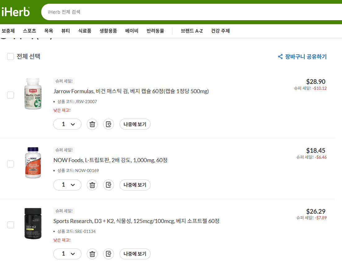 나우 트립토판,스포츠리서치 비타민,제로우 매스틱검까지 필요하신 분 구매하기 좋을 것 같습니다​
