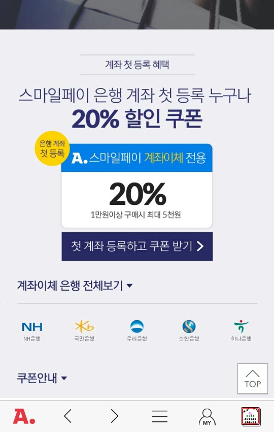 20%/1만+ 옥션 스마일페이 계좌등록 쿠폰 > 자유게시판