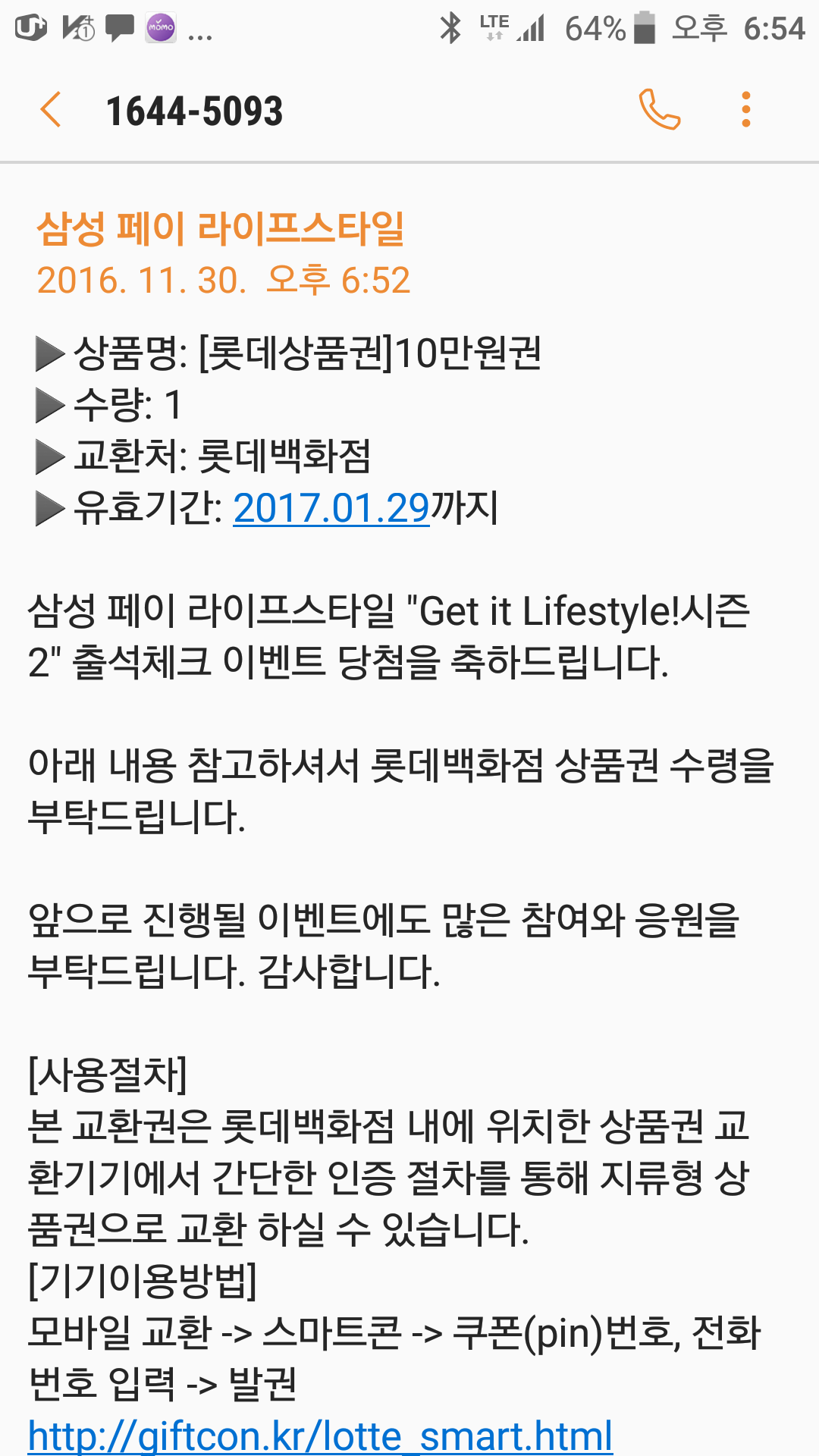 삼성페이 롯데백화점 10만원 당첨 됐네요