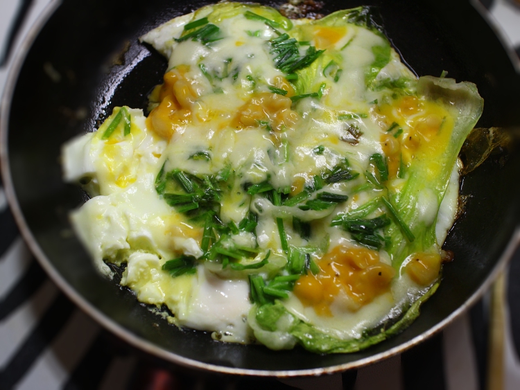 계란 후라이에 채소를 얹고 맥앤치즈도 얹어서 피자치즈 뿌려 약불에 구워 먹고 출근했어요