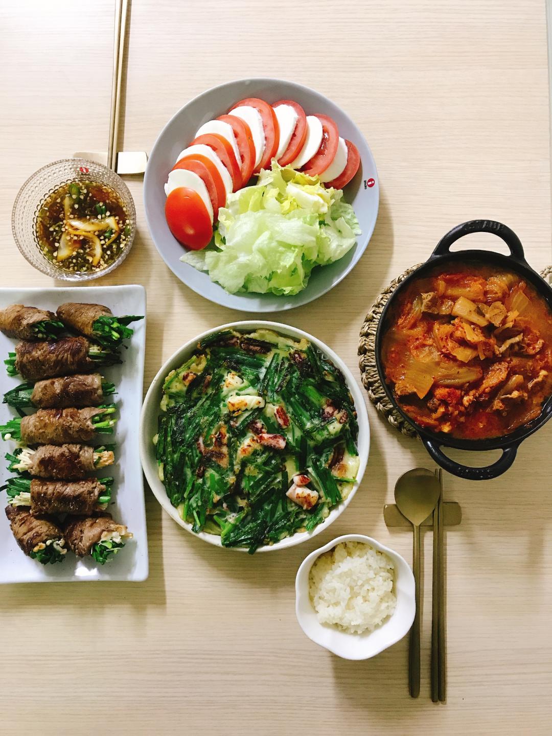 김치찌개 와, 부추오징어전, 소고기부추버섯말이, 카프레제 에요.