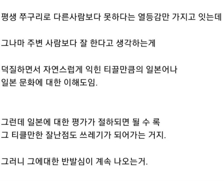 넷째줄까지 제 얘기인 입장으로서.. 동의할 수 없는게 일반인보다 일본문화를 정말 티끌만큼이라도 더 이해하고 있으면 지금 일본이 저러고 있는게 더 짜증나는게 정상이거든요. ㅋㅋㅋ 사무적설명회 때 일본이 하고나온 꼴을 보면 피가 끓어야 정상이고요..