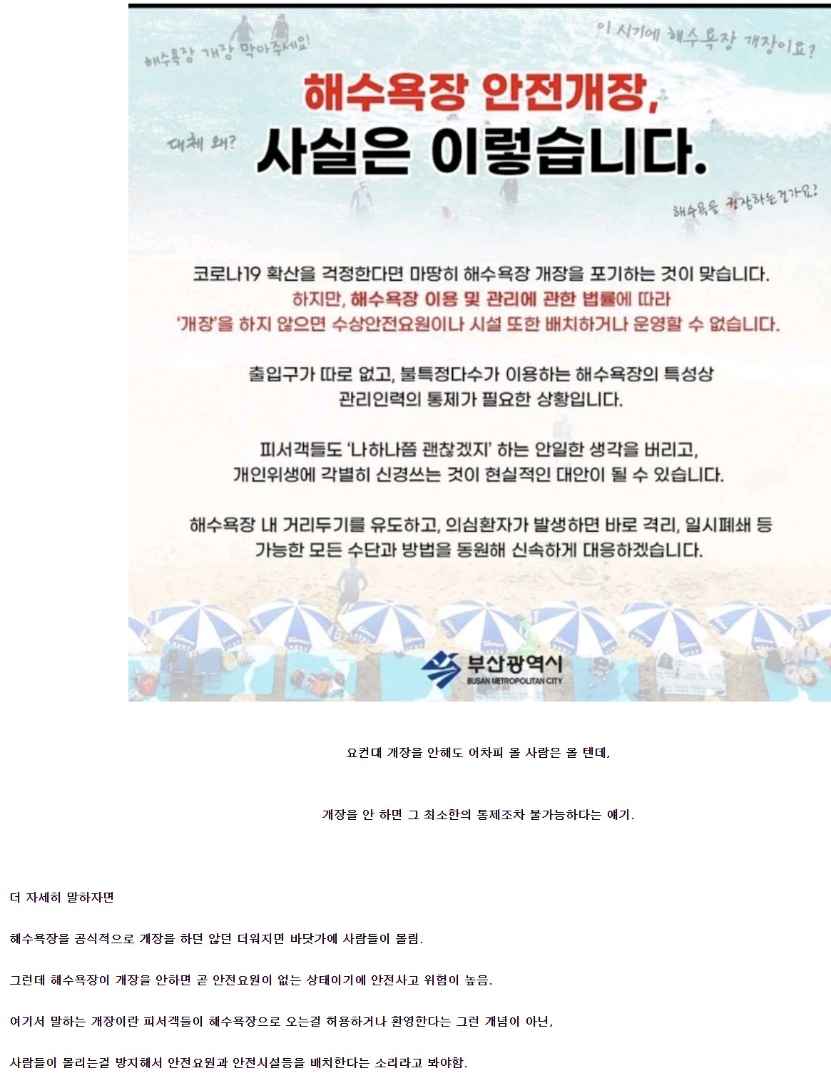 해수욕장 전면 폐장하면 지역경제 타격이 무시못하죠. 정부에서 고민이 많을거에요 |