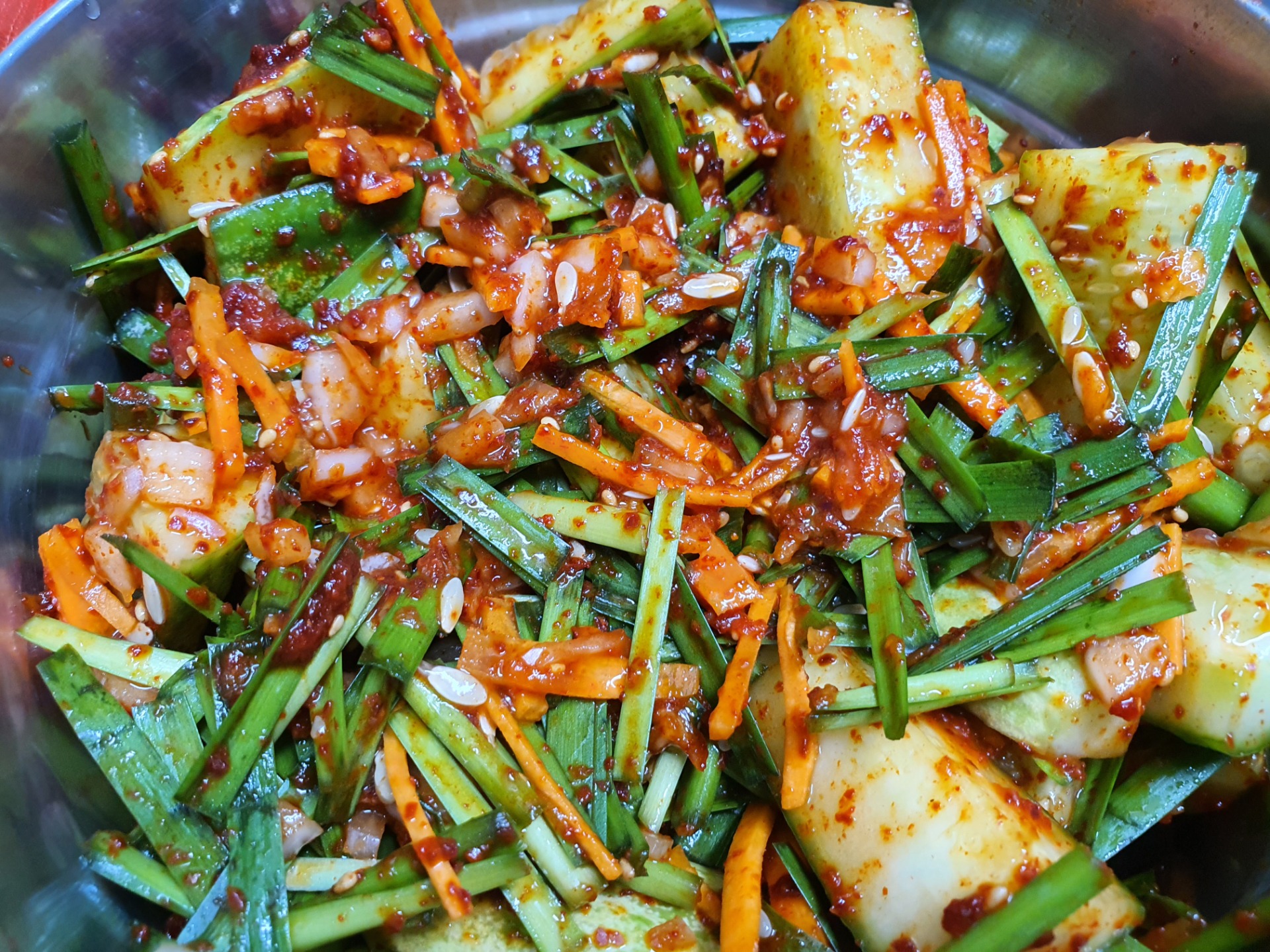 저거는 처음꺼고 나머지는 만드는대로 계속 먹는통에 찍지는 못했어요.. 원래 파김치 담그려했는데 너무 비싸서 오이로 담궜는데요..오이도 비싸긴 하더라고요..그나마 조금  싸서..금방 먹겠어요~