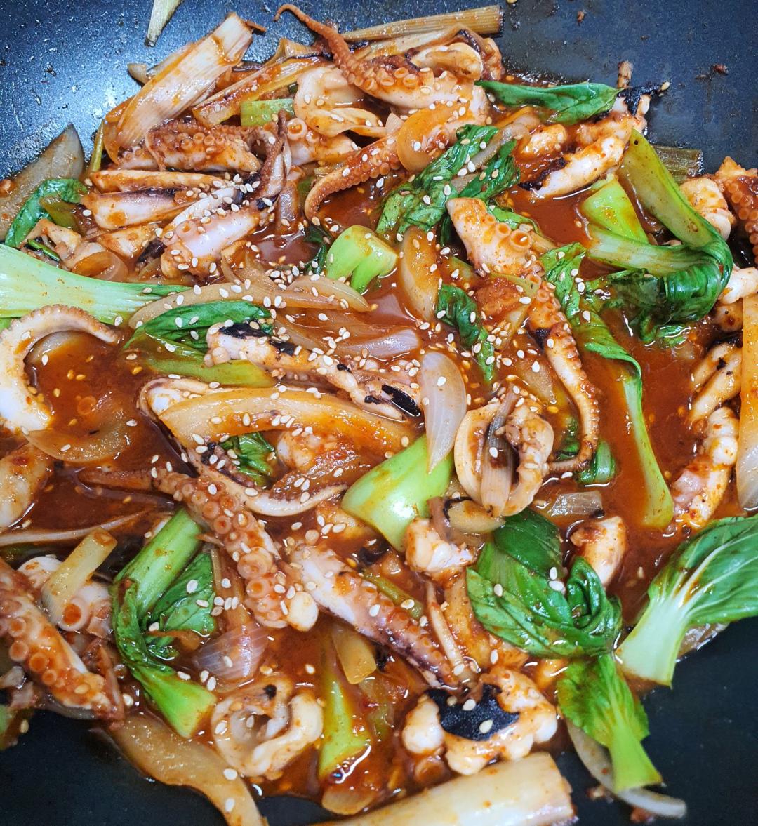 오전에 생물쭈꾸미 사둔걸로 손질후 데쳐서 볶음했는데요.야채 때문인지 국물이 자작하네요..