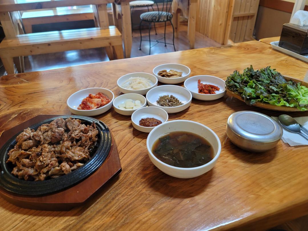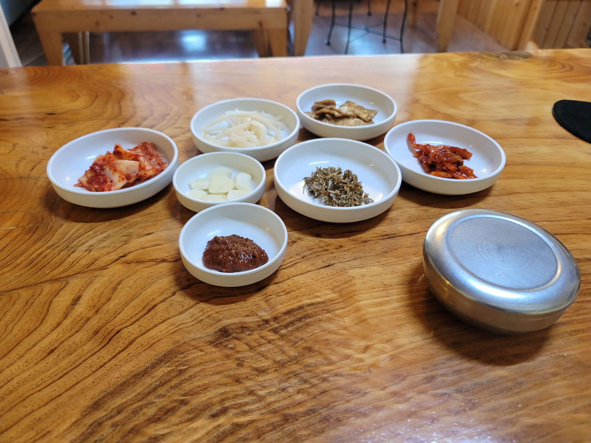 도착하니 사람이 어느정도 차있어서(출발할때 미리 전화로 주문을 넣음) 착석하고 10분을 기다렸네요~ 반찬이 먼저 나오고 5분지나니 메인메뉴가 나왔네요~
