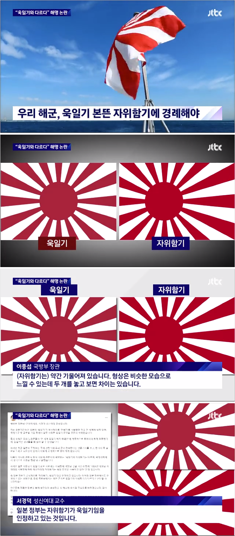 군 관계자는 "국방부도 두 깃발이 비슷하다는 건 인정한다. 다만 욱일기는 일제 패망으로 사라진 셈이라 단순 비교엔 무리가 있다"고 설명했습니다.