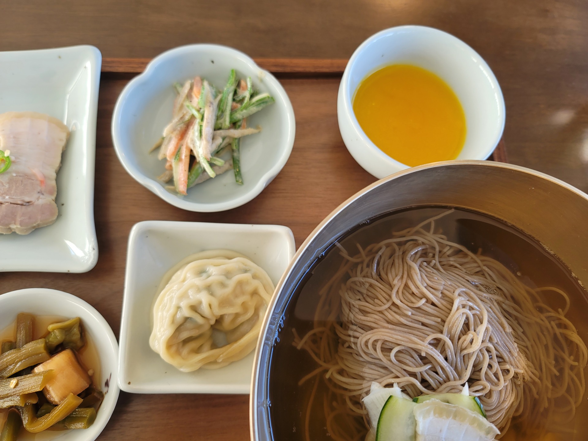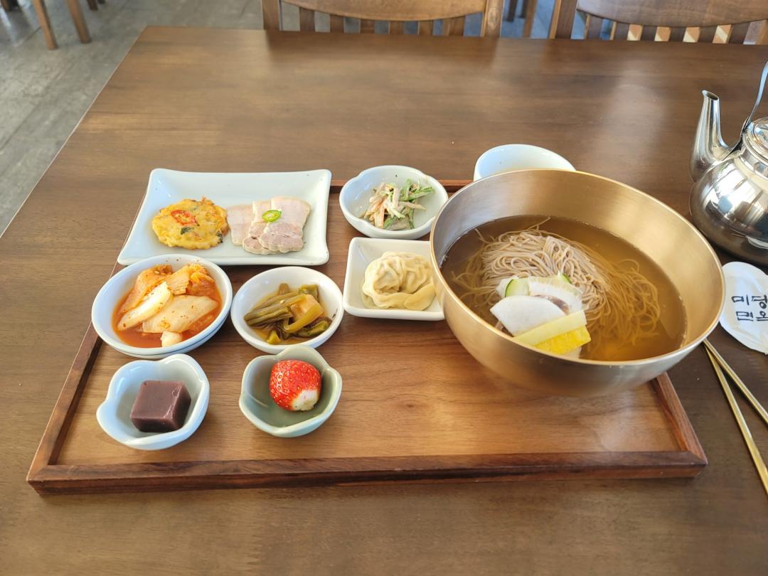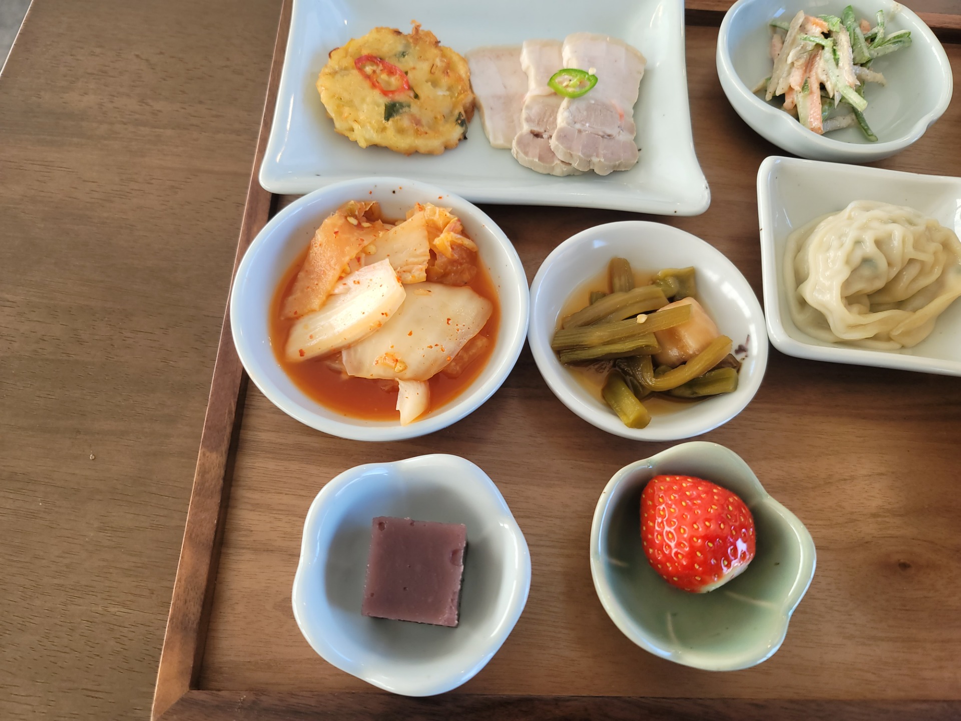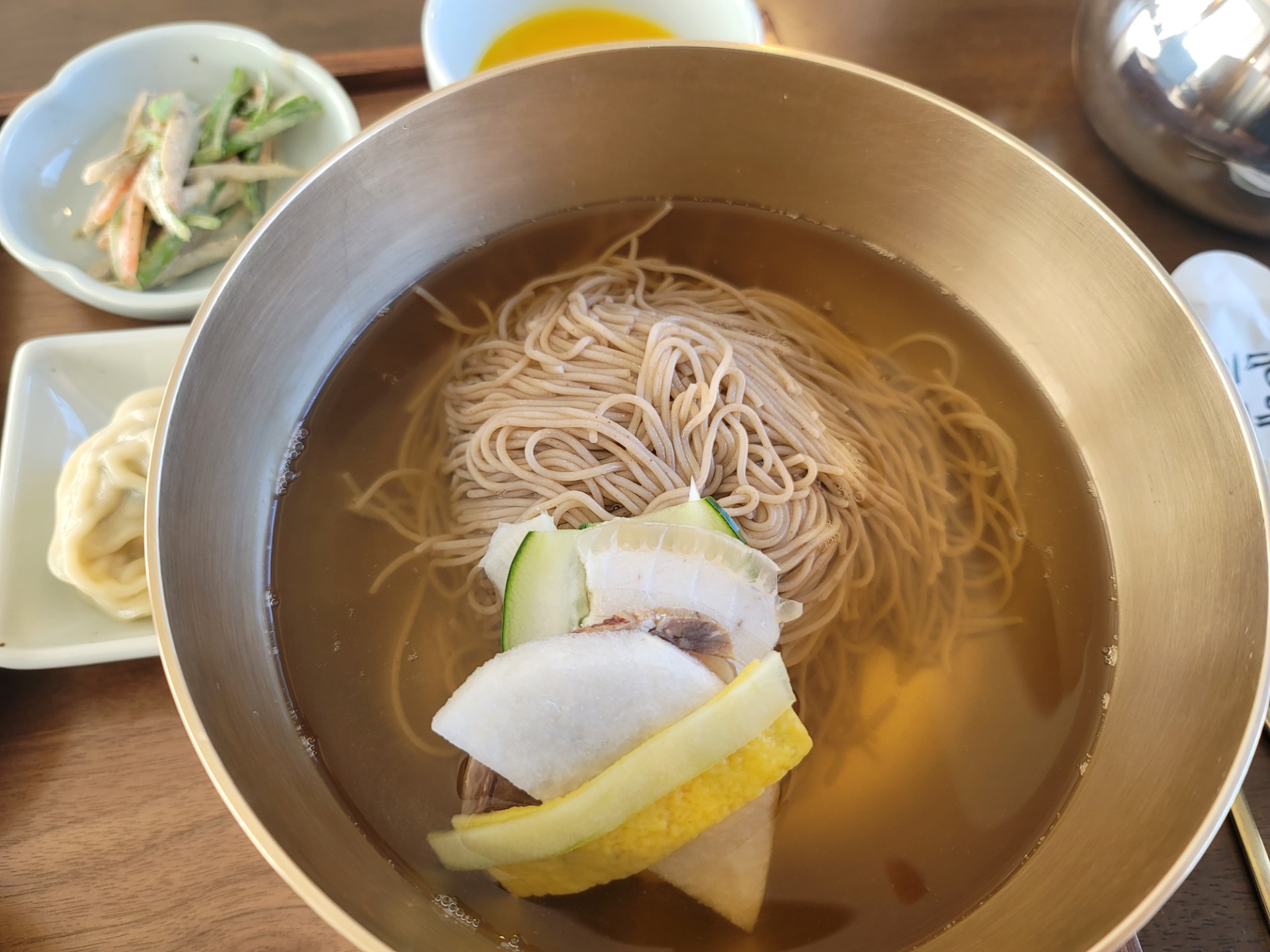 물냉외 전1개, 수육 3점, 후식 2종, 샐러드, 호박죽, 만두 1개로 구성이 되어있네요~~