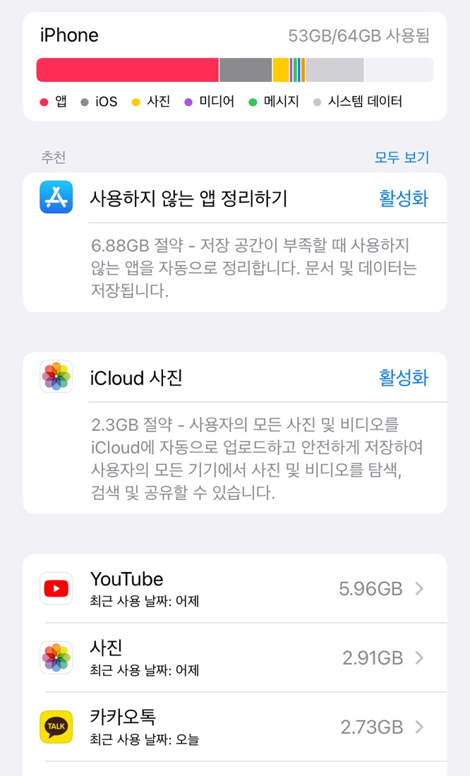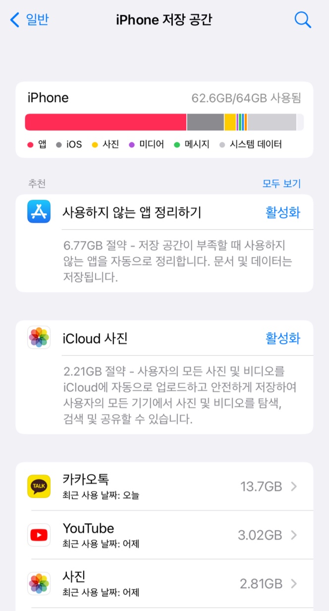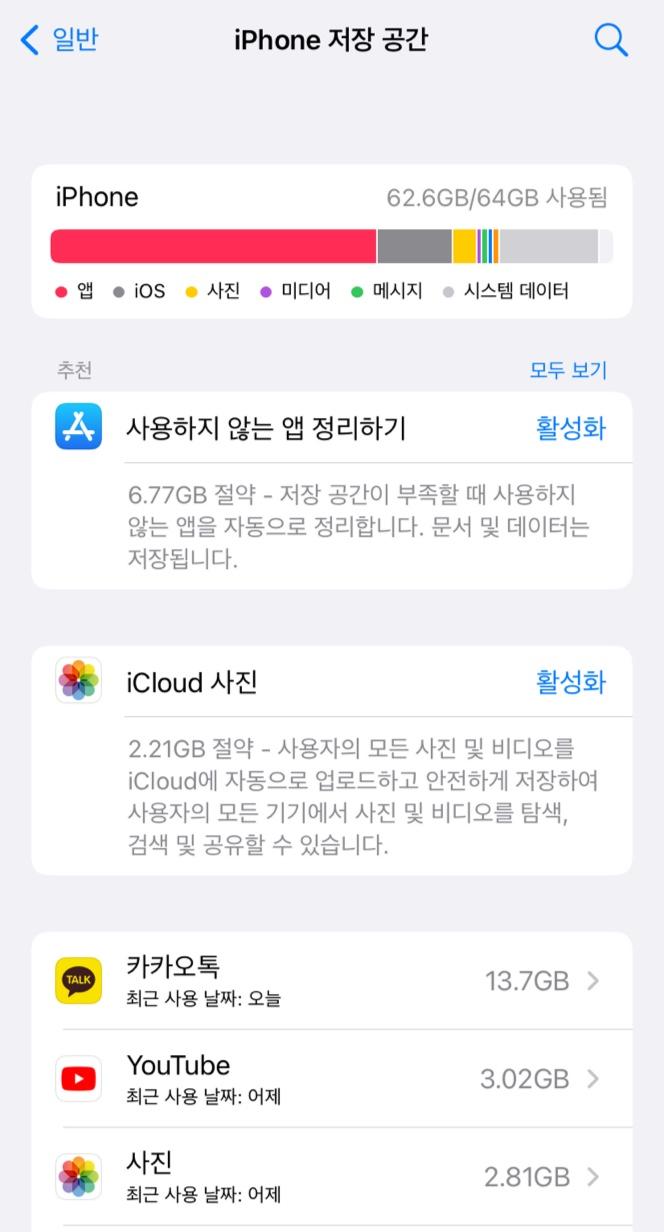 용량 부족해질 때 한 번씩 카톡에서 사진,영상 많이 주고 받는 방들 데이터 삭제해서 데이터 확보하곤 했는데