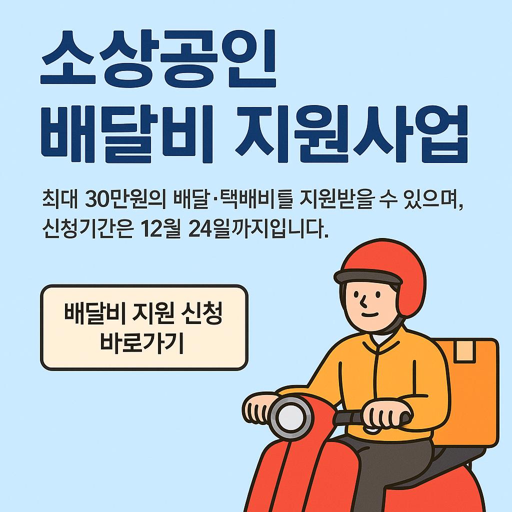 정부는 2025년 고정비 부담 완화를 위해 ‘소상공인 배달·택배비 지원사업’을 시행합니다. 배달앱 또는 직접 배달 실적이 있는 소상공인은 최대 30만원까지 지원받을 수 있으며, 신청 마감은 12월 24일 18시입니다.