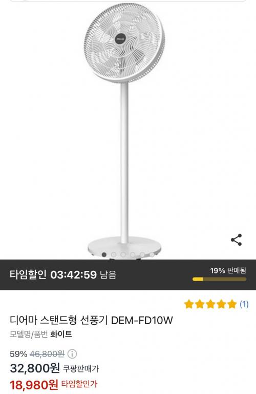 [쿠팡]디어마 스탠드형 선풍기 DEM-FD10W 타임할인(18,980원/무료)
