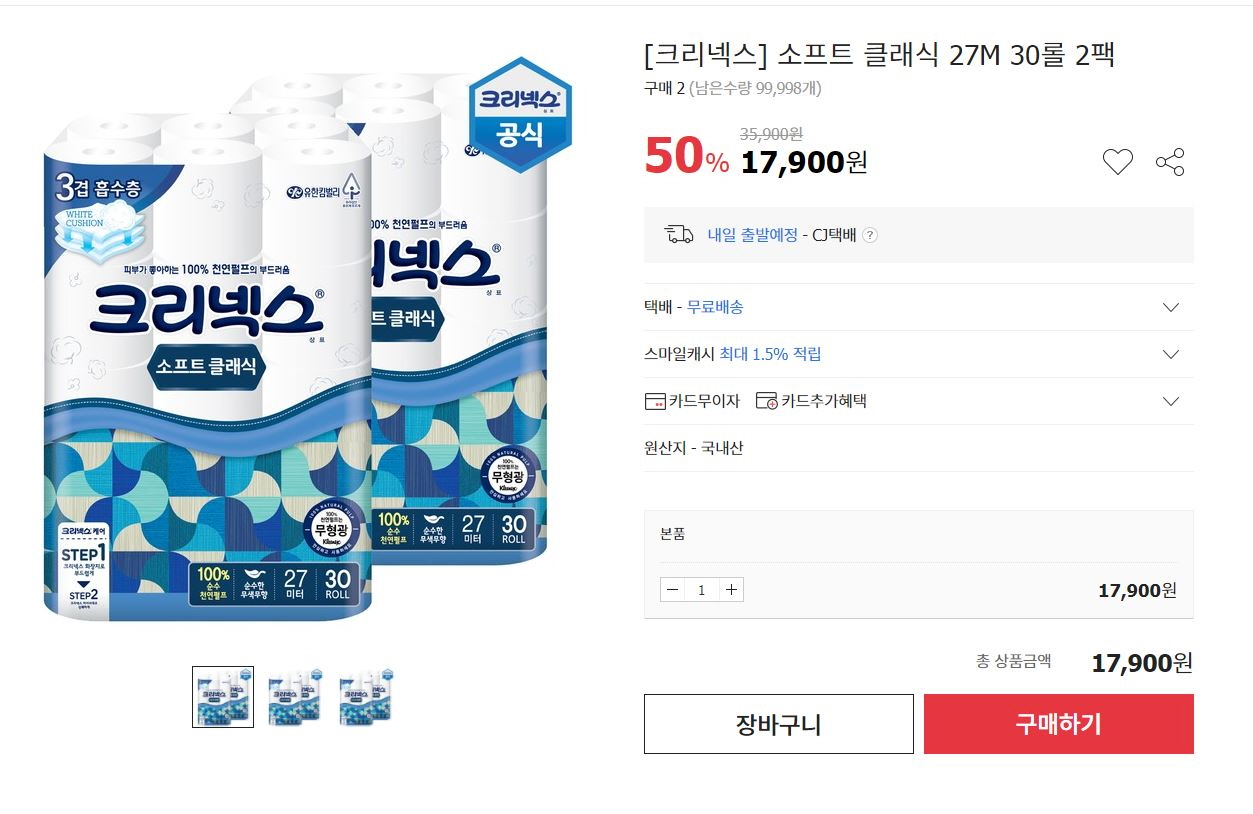 크리넥스 소프트 클래식 2팩을 17,900원에 판매하고 있으니