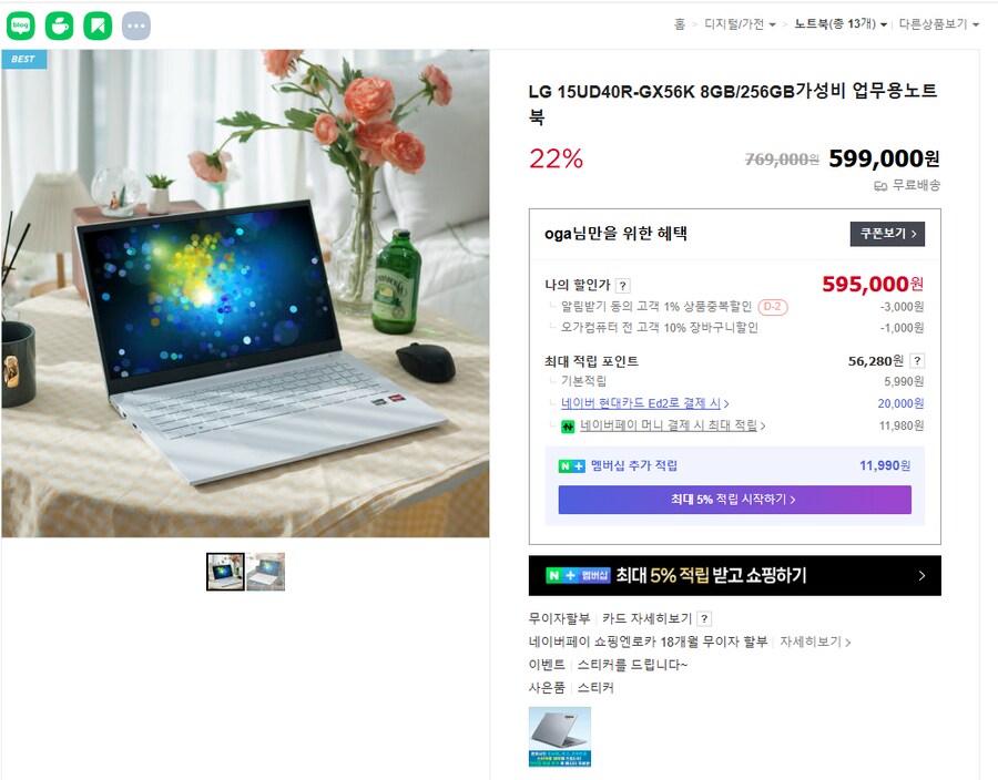 [네이버] LG 15UD40R-GX56K (혜택가 57만원/무료배송)