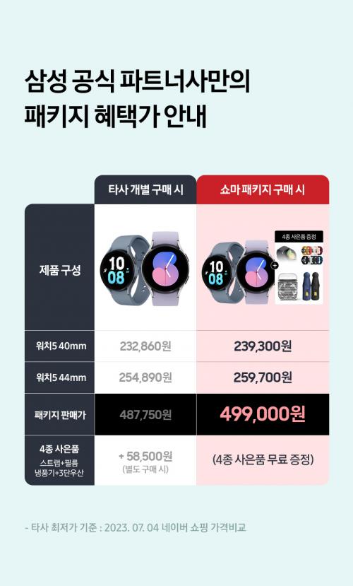 [삼성모바일전문몰][패키지] 갤럭시 워치5 40mm + 갤럭시 워치5 44mm / 워치 스트랩+보호필름+냉풍기+3단우산 (499,000원/무료)